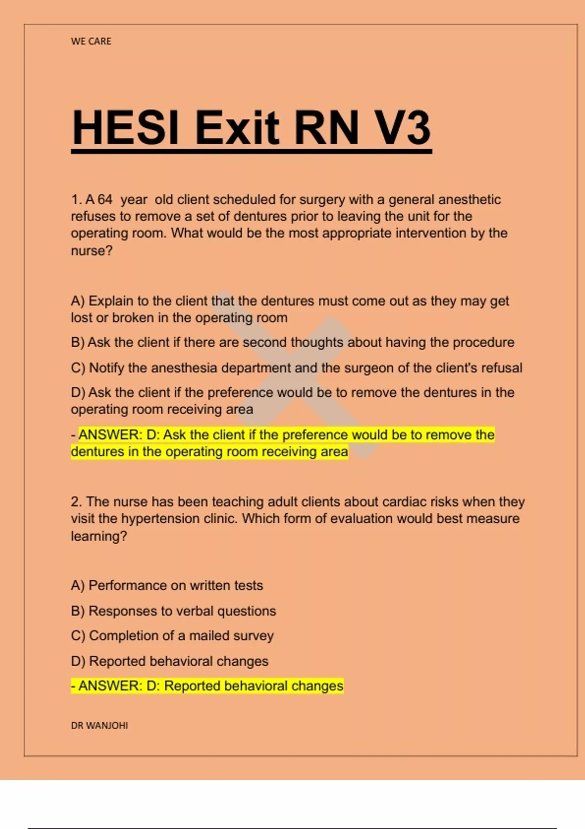 HESI Exit RN V3 1. A 64 year old client scheduled for surgery with a general anesthetic refuses to remove a set of dentures prior to leaving the unit for the operating room. What would be the most appropriate intervention by the nurse? A) Explain to the client that the dentures must come out as they may get lost or broken in the operating room B) Ask the client if there are second thoughts about having the procedure C) Notify the anesthesia department and the surgeon of the client's refusal D) Ask the client if the preference would be to remove the dentures in the operating room receiving area - ANSWER: D: Ask the client if the preference would be to remove the dentures in the operating room receiving area 2. The nurse has been teaching adult clients about cardiac risks when they visit the hypertension clinic. Which form of evaluation would best measure learning? A) Performance on written tests B) Responses to verbal questions C) Completion of a mailed survey D) Reported behavioral changes - ANSWER: D: Reported behavioral changes