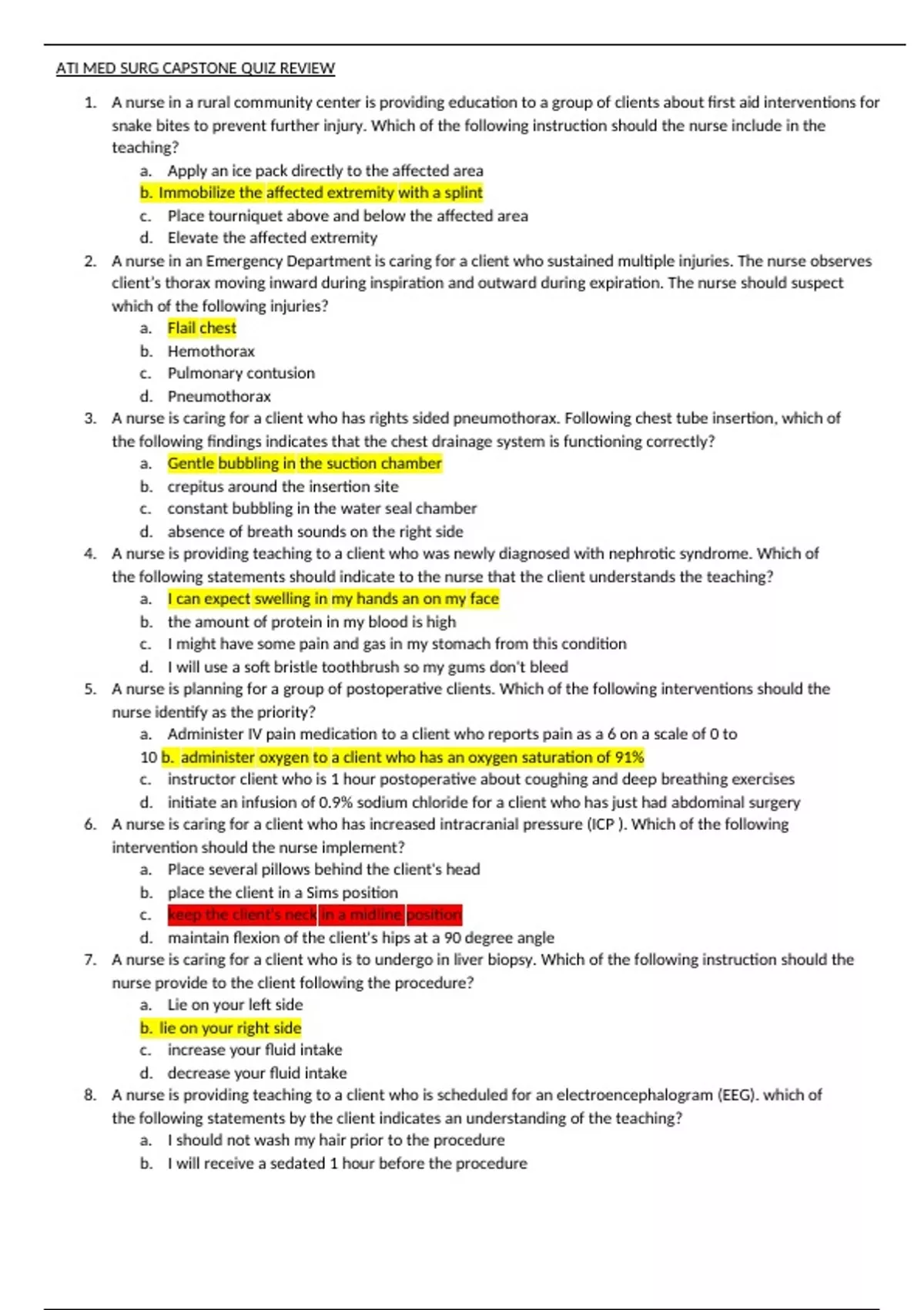 1. A nurse in a rural community center is providing education to a group of clients about first aid interventions for snake bites to prevent further injury. Which of the following instruction should the nurse include in the teaching? a. Apply an ice pack directly to the affected area b. Immobilize the affected extremity with a splint c. Place tourniquet above and below the affected area d. Elevate the affected extremity 2. A nurse in an Emergency Department is caring for a client who sustained multiple injuries. The nurse observes client’s thorax moving inward during inspiration and outward during expiration. The nurse should suspect which of the following injuries? a. Flail chest b. Hemothorax c. Pulmonary contusion d. Pneumothorax 3. A nurse is caring for a client who has rights sided pneumothorax. Following chest tube insertion, which of the following findings indicates that the chest drainage system is functioning correctly? a. Gentle bubbling in the suction chamber b. crepitus around the insertion site c. constant bubbling in the water seal chamber d. absence of breath sounds on the right side 4. A nurse is providing teaching to a client who was newly diagnosed with nephrotic syndrome. Which of the following statements should indicate to the nurse that the client understands the teaching? a. I can expect swelling in my hands an on my face b. the amount of protein in my blood is high c. I might have some pain and gas in my stomach from this condition d. I will use a soft bristle toothbrush so my gums don't bleed 5. A nurse is planning for a group of postoperative clients. Which of the following interventions should the nurse identify as the priority? a. Administer IV pain medication to a client who reports pain as a 6 on a scale of 0 to 10 b. administer oxygen to a client who has an oxygen saturation of 91% c. instructor client who is 1 hour postoperative about coughing and deep breathing exercises d. initiate an infusion of 0.9% sodium chloride for a client who has just had abdominal surgery 6. A nurse is caring for a client who has increased intracranial pressure (ICP ). Which of the following intervention should the nurse implement? a. Place several pillows behind the client's head b. place the client in a Sims position c. keep the client's neck in a midline position d. maintain flexion of the client's hips at a 90 degree angle 7. A nurse is caring for a client who is to undergo in liver biopsy. Which of the following instruction should the nurse provide to the client following the procedure? a. Lie on your left side b. lie on your right side c. increase your fluid intake d. decrease your fluid intake 8. A nurse is providing teaching to a client who is scheduled for an electroencephalogram (EEG). which of the following statements by the client indicates an understanding of the teaching? a. I should not wash my hair prior to the procedure b. I will receive a sedated 1 hour before the procedure c. I should avoid eating prior to the procedure d. I will be exposed to flashes of light during the procedure 9. A nurse is caring for a client who has rheumatoid arthritis and has been taking Prednisone. Which of the following finding should the nurse identify as an adverse effect of this medication? a. Weight loss b. hypoglycemia c. hypertension d. hyperkalemia 10. A nurse is caring for a client who has dehydration. The client has a peripheral IV and has a prescription for an infusion of 0.9% sodium chloride 1000 mL with 40 mEq potassium chloride to infuse over 1 hr. Which of the following action should the nurse take first? a. Teach the client to report findings of IV extravasation b. evaluate the patency of the IV c. consult with the pharmacist about the prescription d. verify the prescription with the provider