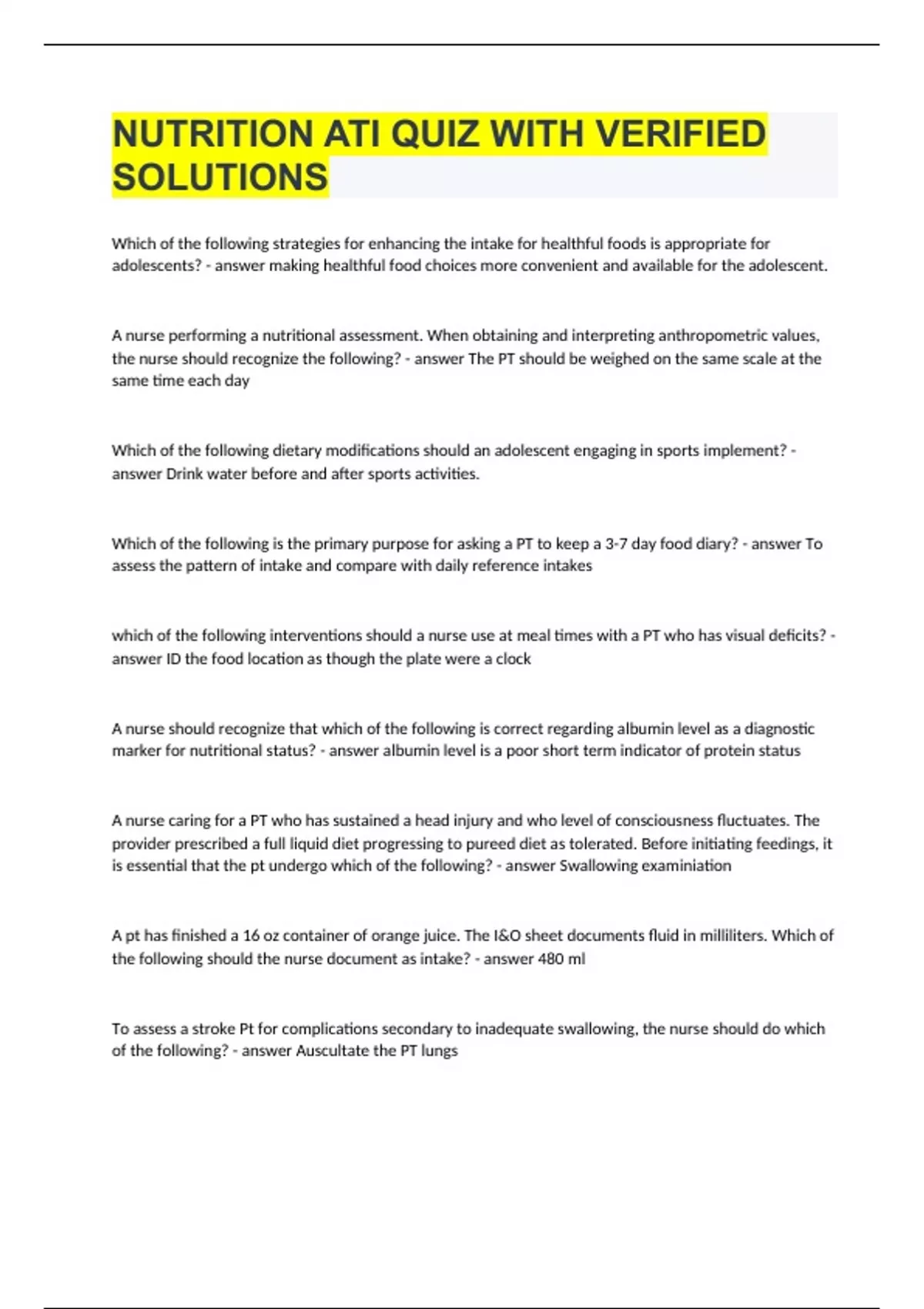 NUTRITION ATI QUIZ WITH VERIFIED SOLUTIONS