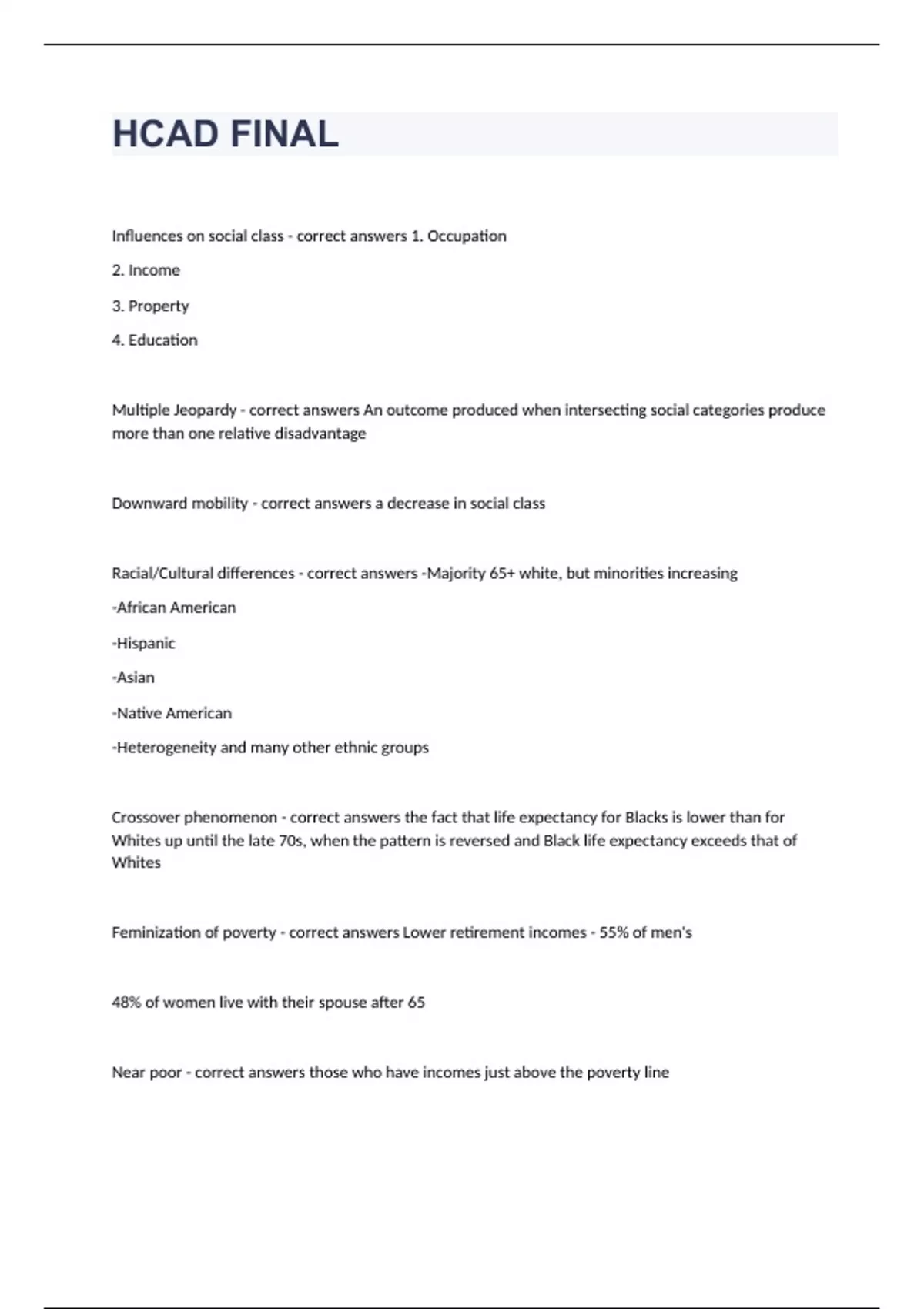 HCAD FINALInfluences on social class - correct answers 1. Occupation 2. Income 3. Property 4. Education Multiple Jeopardy - correct answers An outcome produced when intersecting social categories produce more than one relative disadvantage Downward mobility - correct answers a decrease in social class Racial/Cultural differences - correct answers -Majority 65+ white, but minorities increasing -African American -Hispanic -Asian -Native American -Heterogeneity and many other ethnic groups Crossover phenomenon - correct answers the fact that life expectancy for Blacks is lower than for Whites up until the late 70s, when the pattern is reversed and Black life expectancy exceeds that of Whites Feminization of poverty - correct answers Lower retirement incomes - 55% of men's 48% of women live with their spouse after 65 Near poor - correct answers those who have incomes just above the poverty line 3 legged stool - correct answers 1. Social Security 2. Private Pensions 3. Individual Savings & Assets Life cycle model of savings - correct answers an economic theoretical approach that predicts people will save more in later middle age, as they see retirement ahead. Inflation impact Past Public Policies related to Senior Services - correct answers Social Security Act (1935) Medicare and Medicaid (1965) Employee Retirement Income Security Act (1974) Age Discrimination in Employment Act (1967) Grey Lobby - correct answers Groups that focus on the interests and concerns of older persons Aging Interest Groups The American Association of Retired Personas (AARP) - correct answers America's leading organization for people aged fifty and older, providing member benefits, marketing services, and lobbying on their behalf. Older Americans Act - correct answers Nutrition Programs Seniors Citizens Centers Caregiver Support Ombudsman Program - correct answers specially trained individual who works with the elderly and their families, health care providers, and other concerned individuals to improve quality of care and quality of life Aging Network - correct answers the system of social services for older adults funded by the Older Americans Act Poverty & Wealth among seniors - correct answers Large reduction over the past 30 years Biggest gains in income were in the 60's and 70's Supplemental Security Income (SSI) - correct answers Means- tested - Allows people under the poverty line to get help Cash benefit program - elderly poor, blind, and disabled. Cumulative disadvantage - correct answers Lower socioeconomic status over the life course tends to produce cumulative disadvantage, which is perpetuated in old age Social Security Act-What? When? - correct answers Passed in 1935 First benefits paid in 1940 A monthly check that replaces part of your income when you reduce your hours or stop working altogether. You must pay in (taxes) to get your pay out Who/how many rely on SS? - correct answers Most of the social security benefits go to retirees, but survivors and the disabled make up substantial shares. Retirement: 64%: 314 billion