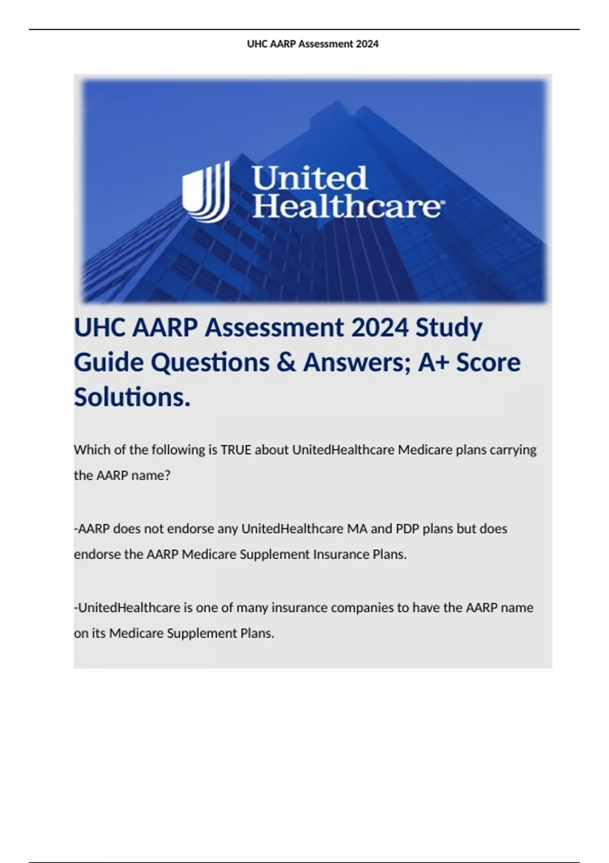 UHC AARP Assessment 2024 Study Guide Questions & Answers; A+ Score Solutions.