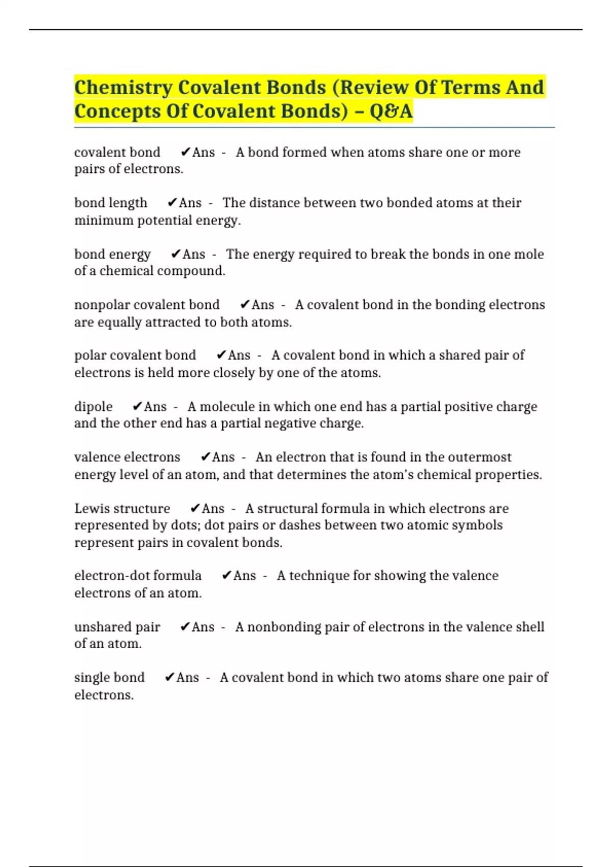 Chemistry Covalent Bonds (Review Of Terms And Concepts Of Covalent Bonds) – Q&A