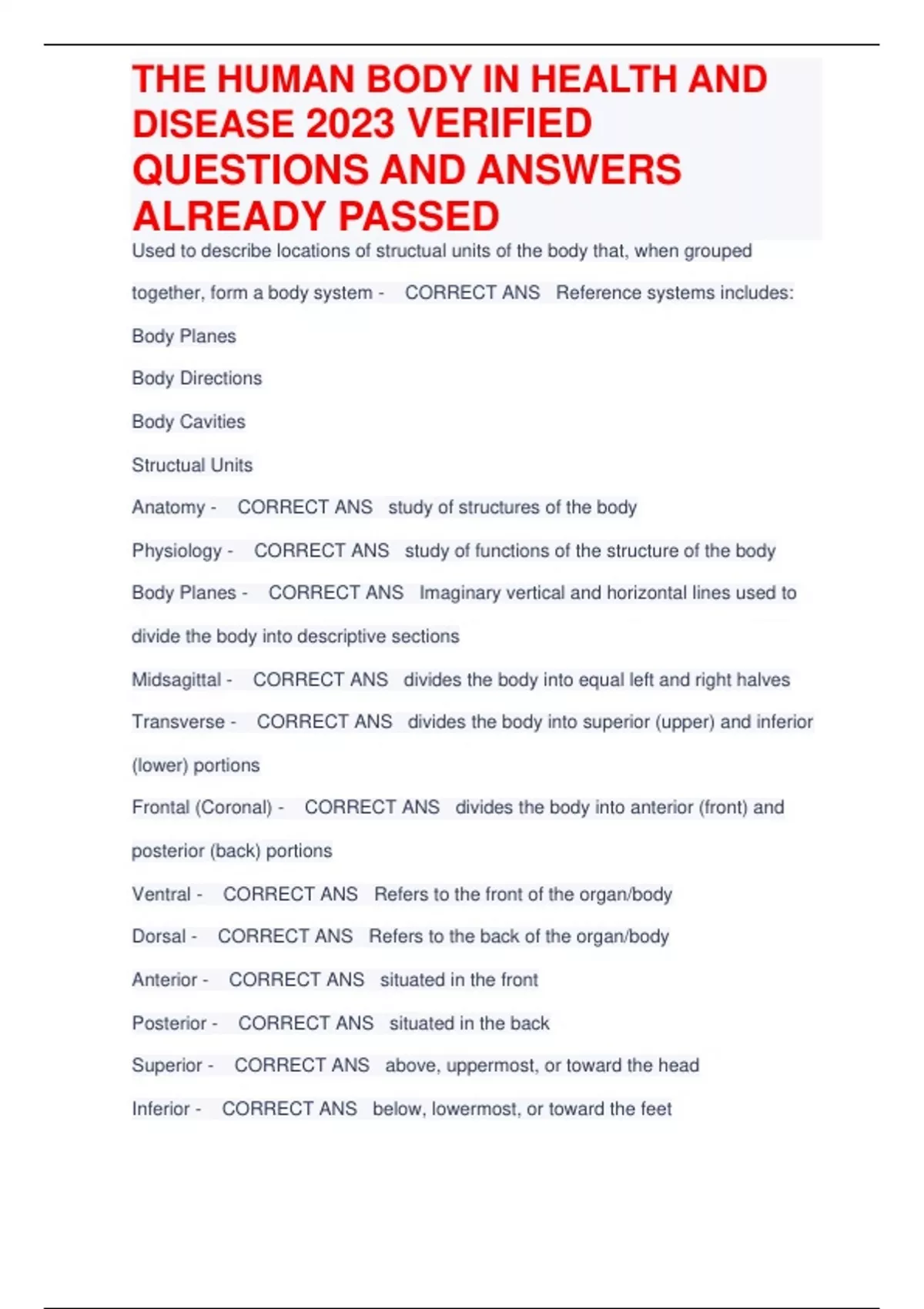 THE HUMAN BODY IN HEALTH AND DISEASE 2023 VERIFIED QUESTIONS AND ANSWERS ALREADY PASSED Used to describe locations of structual units of the body that, when grouped together, form a body system - CORRECT ANS Reference systems includes: Body Planes Body Directions Body Cavities Structual Units Anatomy - CORRECT ANS study of structures of the body Physiology - CORRECT ANS study of functions of the structure of the body Body Planes - CORRECT ANS Imaginary vertical and horizontal lines used to divide the body into descriptive sections Midsagittal - CORRECT ANS divides the body into equal left and right halves Transverse - CORRECT ANS divides the body into superior (upper) and inferior (lower) portions Frontal (Coronal) - CORRECT ANS divides the body into anterior (front) and posterior (back) portions Ventral - CORRECT ANS Refers to the front of the organ/body Dorsal - CORRECT ANS Refers to the back of the organ/body Anterior - CORRECT ANS situated in the front Posterior - CORRECT ANS situated in the back Superior - CORRECT ANS above, uppermost, or toward the head Inferior - CORRECT ANS