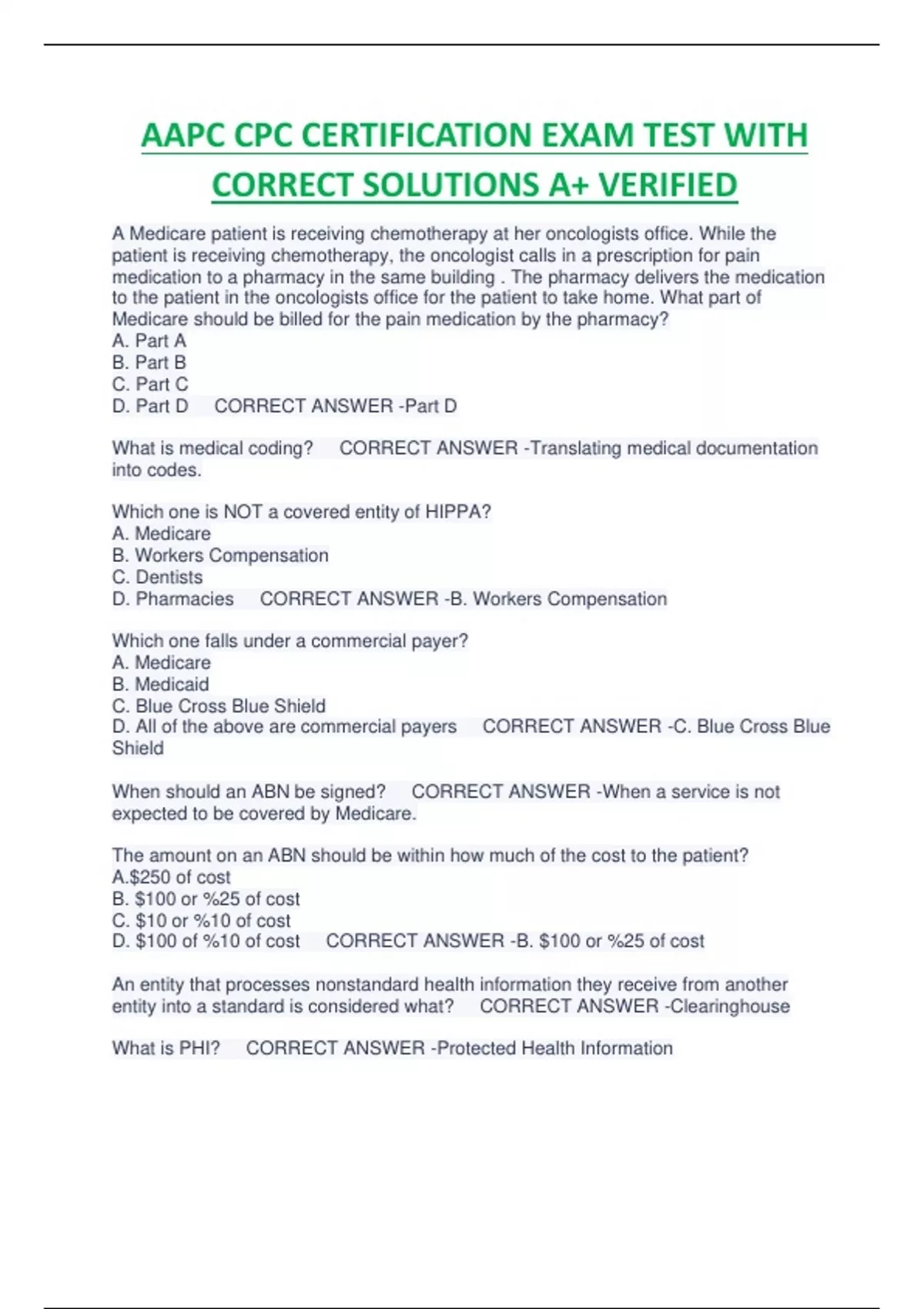 AAPC CPC CERTIFICATION EXAM TEST WITH CORRECT SOLUTIONS A+ VERIFIED
