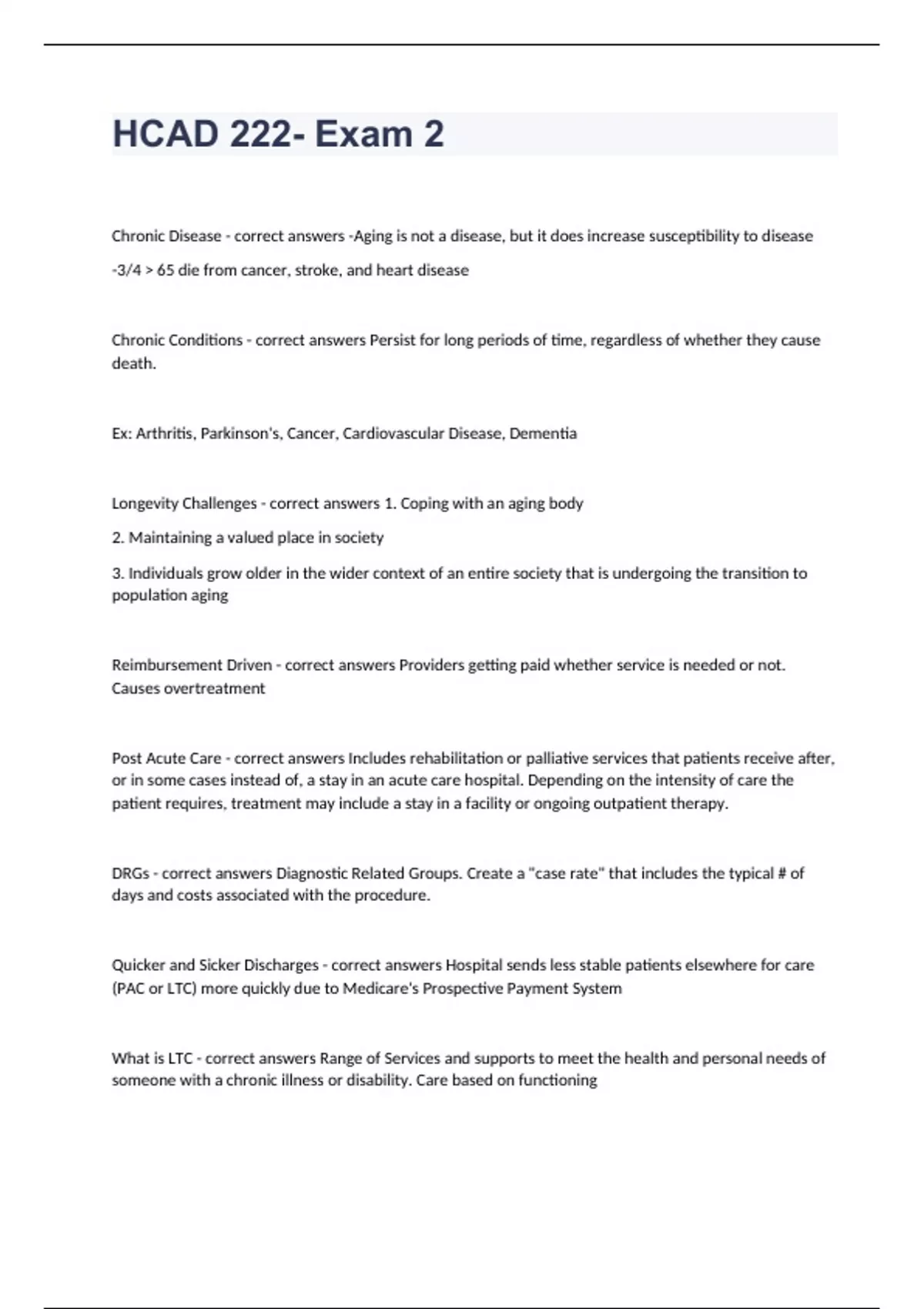 HCAD 222- Exam 2Chronic Disease - correct answers -Aging is not a disease, but it does increase susceptibility to disease -3/4 > 65 die from cancer, stroke, and heart disease Chronic Conditions - correct answers Persist for long periods of time, regardless of whether they cause death. Ex: Arthritis, Parkinson's, Cancer, Cardiovascular Disease, Dementia Longevity Challenges - correct answers 1. Coping with an aging body 2. Maintaining a valued place in society 3. Individuals grow older in the wider context of an entire society that is undergoing the transition to population aging Reimbursement Driven - correct answers Providers getting paid whether service is needed or not. Causes overtreatment Post Acute Care - correct answers Includes rehabilitation or palliative services that patients receive after, or in some cases instead of, a stay in an acute care hospital. Depending on the intensity of care the patient requires, treatment may include a stay in a facility or ongoing outpatient therapy. DRGs - correct answers Diagnostic Related Groups. Create a "case rate" that includes the typical # of days and costs associated with the procedure. Quicker and Sicker Discharges - correct answers Hospital sends less stable patients elsewhere for care (PAC or LTC) more quickly due to Medicare's Prospective Payment System What is LTC - correct answers Range of Services and supports to meet the health and personal needs of someone with a chronic illness or disability. Care based on functioning