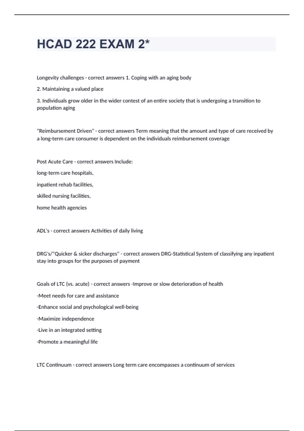HCAD 222 EXAM 2*Longevity challenges - correct answers 1. Coping with an aging body 2. Maintaining a valued place 3. Individuals grow older in the wider contest of an entire society that is undergoing a transition to population aging "Reimbursement Driven" - correct answers Term meaning that the amount and type of care received by a long-term care consumer is dependent on the individuals reimbursement coverage Post Acute Care - correct answers Include: long-term care hospitals, inpatient rehab facilities, skilled nursing facilities, home health agencies ADL's - correct answers Activities of daily living DRG's/"Quicker & sicker discharges" - correct answers DRG-Statistical System of classifying any inpatient stay into groups for the purposes of payment Goals of LTC (vs. acute) - correct answers -Improve or slow deterioration of health -Meet needs for care and assistance -Enhance social and psychological well-being -Maximize independence -Live in an integrated setting -Promote a meaningful life LTC Continuum - correct answers Long term care encompasses a continuum of services Nursing Homes - correct answers Touchstone for LTC -Misnomer Dual constituencies -PAC -LTC Average age: 79 Activity levels are higher than ever before assisted living Assisted Living - correct answers -Typical demographic: 87 year old white female -Residential environment that enhances functioning and is homelike 1. residential environment: private space and public space 2. Philosophy of consumer control over space, care and lifestyle 3. Service capability -Routine services -Specialized services -Term has many meanings -Housing with (separate) services -Congregate care with single staff -Need for uniform classification system to allow consumers to make informed comparisons Home and Community Based Services (HCBS) - correct answers Rehabilitation/Skilled Care Home health Homemaking, personal care, & attendant services Emergency systems Home delivered meals Home Modification Transportation