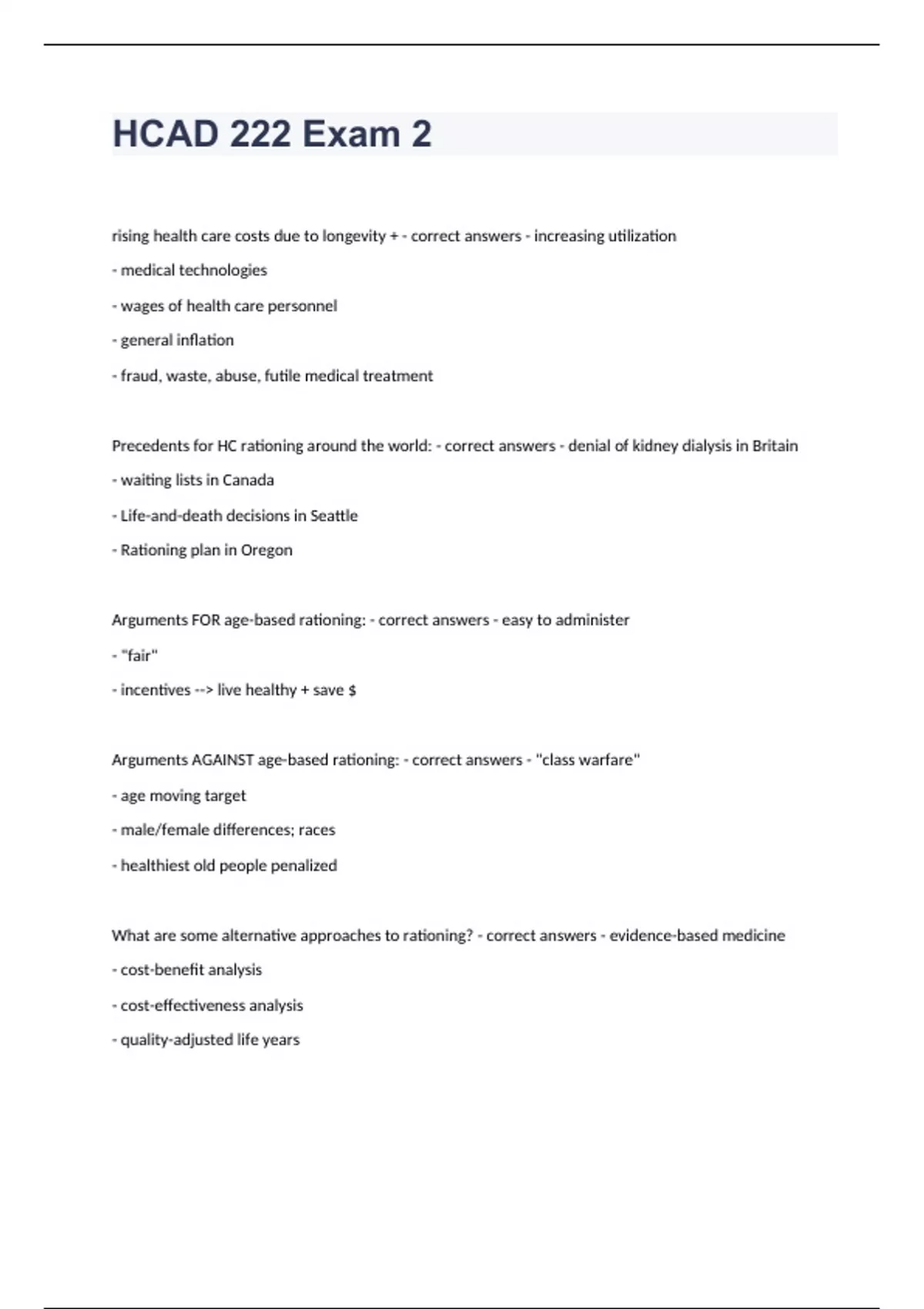 HCAD 222 Exam 2rising health care costs due to longevity + - correct answers - increasing utilization - medical technologies - wages of health care personnel - general inflation - fraud, waste, abuse, futile medical treatment Precedents for HC rationing around the world: - correct answers - denial of kidney dialysis in Britain - waiting lists in Canada - Life-and-death decisions in Seattle - Rationing plan in Oregon Arguments FOR age-based rationing: - correct answers - easy to administer - "fair" - incentives --> live healthy + save $ Arguments AGAINST age-based rationing: - correct answers - "class warfare" - age moving target - male/female differences; races - healthiest old people penalized What are some alternative approaches to rationing? - correct answers - evidence-based medicine - cost-benefit analysis - cost-effectiveness analysis - quality-adjusted life years