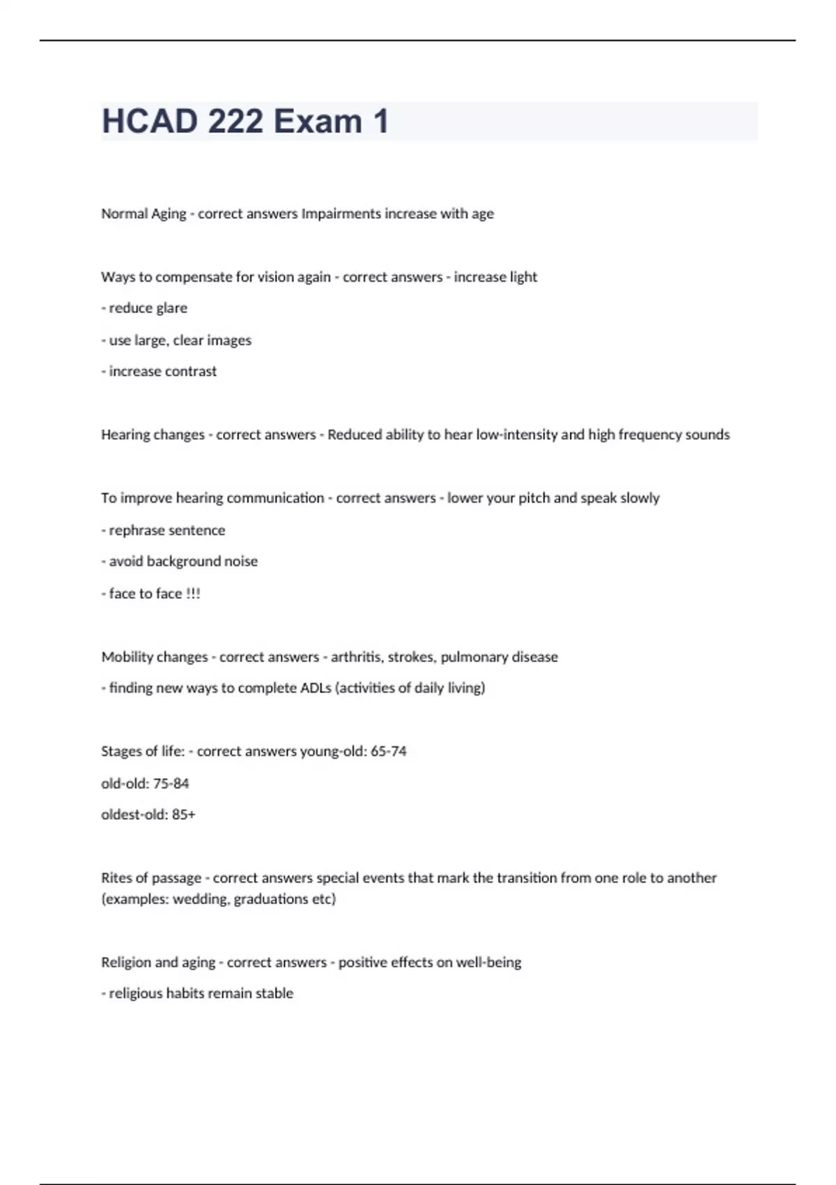 HCAD 222 Exam 1 Normal Aging - correct answers Impairments increase with age Ways to compensate for vision again - correct answers - increase light - reduce glare - use large, clear images - increase contrast Hearing changes - correct answers - Reduced ability to hear low-intensity and high frequency sounds To improve hearing communication - correct answers - lower your pitch and speak slowly - rephrase sentence - avoid background noise - face to face !!! Mobility changes - correct answers - arthritis, strokes, pulmonary disease - finding new ways to complete ADLs (activities of daily living) Stages of life: - correct answers young-old: 65-74 old-old: 75-84 oldest-old: 85+ Rites of passage - correct answers special events that mark the transition from one role to another (examples: wedding, graduations etc) Religion and aging - correct answers - positive effects on well-being - religious habits remain stable - multiple roles for fulfillment lifespan vs. life course - correct answers understanding old age as a part of the entire course of human life-- meaningful (life course) vs. life span is how long you live aging population is - correct answers a population in which the percentage that is age 65 and older is increasing relative to other age groups modernization theory of aging - correct answers The status of older adults declines as societies become more modern (Cockerham 1997) disengagement theory - correct answers Looks at old age as a time when both the older person and society engage in mutual separation in the case of retirement from work--can be an inner attitude or behavior (Cumming and Henry 1961) activity theory - correct answers the more active and involved older adults are, the more likely they are to be satisfied with their lives continuity theory - correct answers as people grow older they're inclined to maintain the same habits, personality and lifestyle they've always had cognitive theory - correct answers based on empirical results of the Bonn Longitudinal study of aging: the perception of change is most impact on behavior (Hans Thomal) life expectancy - correct answers 78.74 years old Life review - correct answers natural, universal process stimulated by awareness of approaching death Senescence - correct answers process by which the capacity for cell division, growth and function is lost overtime Telomeres - correct answers Repeated DNA sequences at the ends of eukaryotic chromosomes.