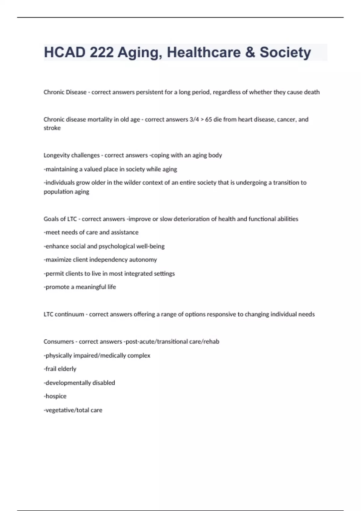HCAD 222 Aging, Healthcare & SocietyChronic Disease - correct answers persistent for a long period, regardless of whether they cause death Chronic disease mortality in old age - correct answers 3/4 > 65 die from heart disease, cancer, and stroke Longevity challenges - correct answers -coping with an aging body -maintaining a valued place in society while aging -individuals grow older in the wilder context of an entire society that is undergoing a transition to population aging Goals of LTC - correct answers -improve or slow deterioration of health and functional abilities -meet needs of care and assistance -enhance social and psychological well-being -maximize client independency autonomy -permit clients to live in most integrated settings -promote a meaningful life LTC continuum - correct answers offering a range of options responsive to changing individual needs Consumers - correct answers -post-acute/transitional care/rehab -physically impaired/medically complex -frail elderly -developmentally disabled -hospice -vegetative/total care