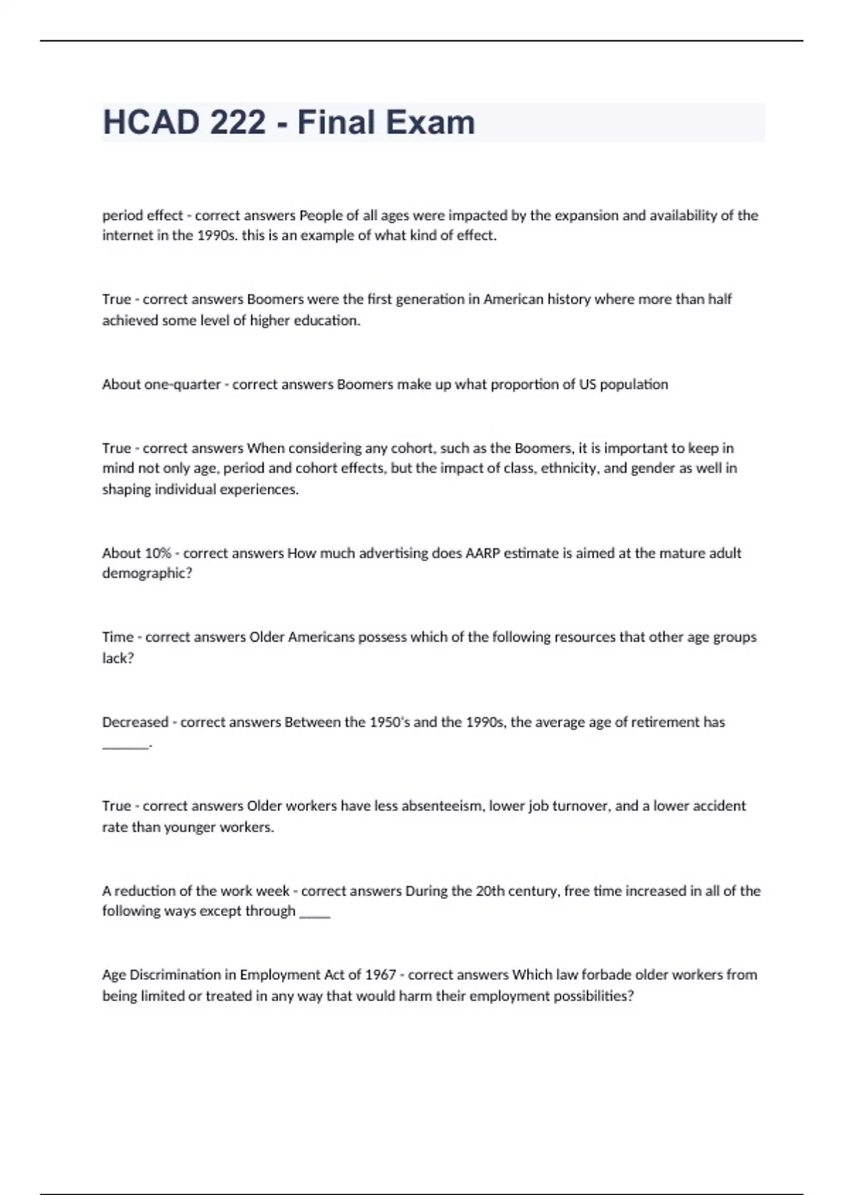 HCAD 222 - Final Examperiod effect - correct answers People of all ages were impacted by the expansion and availability of the internet in the 1990s. this is an example of what kind of effect. True - correct answers Boomers were the first generation in American history where more than half achieved some level of higher education. About one-quarter - correct answers Boomers make up what proportion of US population True - correct answers When considering any cohort, such as the Boomers, it is important to keep in mind not only age, period and cohort effects, but the impact of class, ethnicity, and gender as well in shaping individual experiences. About 10% - correct answers How much advertising does AARP estimate is aimed at the mature adult demographic? Time - correct answers Older Americans possess which of the following resources that other age groups lack? Decreased - correct answers Between the 1950's and the 1990s, the average age of retirement has ______. True - correct answers Older workers have less absenteeism, lower job turnover, and a lower accident rate than younger workers. A reduction of the work week - correct answers During the 20th century, free time increased in all of the following ways except through ____ Age Discrimination in Employment Act of 1967 - correct answers Which law forbade older workers from being limited or treated in any way that would harm their employment possibilities?