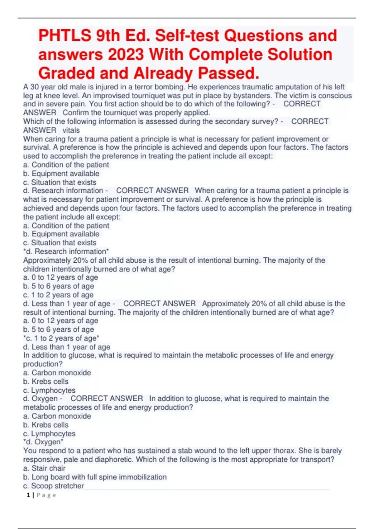 PHTLS 9th Ed. Self-test Questions and answers 2023 With Complete Solution Graded and Already Passed. A 30 year old male is injured in a terror bombing. He experiences traumatic amputation of his left leg at knee level. An improvised tourniquet was put in place by bystanders. The victim is conscious and in severe pain. You first action should be to do which of the following? - CORRECT ANSWER Confirm the tourniquet was properly applied. Which of the following information is assessed during the secondary survey? - CORRECT ANSWER vitals When caring for a trauma patient a principle is what is necessary for patient improvement or survival. A preference is how the principle is achieved and depends upon four factors. The factors used to accomplish the preference in treating the patient include all except: a. Condition of the patient b. Equipment available c. Situation that exists d. Research information - CORRECT ANSWER When caring for a trauma patient a principle is what is necessary for patient improvement or survival. A preference is how the principle is achieved and depends upon four factors. The factors used to accomplish the preference in treating the patient include all except: a. Condition of the patient b. Equipment available c. Situation that exists *d. Research information* Approximately 20% of all child abuse is the result of intentional burning. The majority of the children intentionally burned are of what age? a. 0 to 12 years of age b. 5 to 6 years of age c. 1 to 2 years of age d. Less than 1 year of age - CORRECT ANSWER Approximately 20% of all child abuse is the result of intentional burning. The majority of the children intentionally burned are of what age? a. 0 to 12 years of age b. 5 to 6 years of age *c. 1 to 2 years of age* d. Less than 1 year of age In addition to glucose, what is required to maintain the metabolic processes of life and energy production? a. Carbon monoxide b. Krebs cells c. Lymphocytes d. Oxygen - CORRECT ANSWER In addition to glucose, what is required to maintain the metabolic processes of life and energy production? a. Carbon monoxide b. Krebs cells c. Lymphocytes *d. Oxygen* You respond to a patient who has sustained a stab wound to the left upper thorax. She is barely responsive, pale and diaphoretic. Which of the following is the most appropriate for transport? a. Stair chair b. Long board with full spine immobilization c. Scoop stretcher 2 | P a g e PHTLS 9th Ed. Self-test Questions and answers 2023 With Complete Solution Graded and Already Passed. d. Short immobilization device - CORRECT ANSWER You respond to a patient who has sustained a stab wound to the left upper thorax. She is barely responsive, pale and diaphoretic. Which of the following is the most appropriate for transport? a. Stair chair b. Long board with full spine immobilization *c. Scoop stretcher* d. Short immobilization device Units responding to a motor vehicle accident on the highway should consider which of the following as part of their pre-arrival assessment? a. Calling for more units to respond b. Weather conditions c. The need for immediate transport d. Post-exposure prophylaxis - CORRECT ANSWER Units responding to a motor vehicle accident on the highway should consider which of the following as part of their pre-arrival assessment? a. Calling for more units to respond *b. Weather conditions* c. The need for immediate transport d. Post-exposure prophylaxis The most appropriate airway maneuver in the initial management of a trauma patient is which of the following? a. Head tilt, chin lift b. Supraglottic airway c. Trauma jaw thrust d. Oropharyngeal airway - CORRECT ANSWER The most appropriate airway maneuver in the initial management of a trauma patient is which of the following? a. Head tilt, chin lift b. Supraglottic airway *c. Trauma jaw thrust* d. Oropharyngeal airway When verifying ET tube placement on a perfusing patient, the "gold standard" of monitoring is considered to be? a. Colorimetric carbon dioxide detector b. Pulse oximetry c. Listening to lung sounds d. EtCO2 - CORRECT ANSWER When verifying ET tube placement on a perfusing patient, the "gold standard" of monitoring is considered to be? a. Colorimetric carbon dioxide detector b. Pulse oximetry c. Listening to lung sounds *d. EtCO2* A patient presents with a blunt trauma injury to the chest. On exam, he has absent breath sounds on one side of his chest and respiratory distress. Which additional sign would indicate that the patient has a tension pneumothorax? a. Distended neck veins b. Muffled heart sounds c. Narrowed pulse pressure 3 | P a g e PHTLS 9th Ed. Self-test Questions and answers 2023 With Complete Solution Graded and Already Passed. d. Tracheal deviation towards the side of injury - CORRECT ANSWER A patient presents with a blunt trauma injury to the chest. On exam, he has absent breath sounds on one side of his chest and respiratory distress. Which additional sign would indicate that the patient has a tension pneumothorax? *a. Distended neck veins* b. Muffled heart sounds c. Narrowed pulse pressure d. Tracheal deviation away from the side of injury Hemostatic agents should be used for excessive bleeding when direct pressure alone does not work. The proper way to use most hemostatic agents is which of the following? a. Placing the agent around the edges of the wound b. Placing the agent properly into the wound and holding direct pressure c. Only using it after a tourniquet has been applied for 10 minutes d. Hemostatic agents should never be used unless you have a fall in blood pressure - CORRECT ANSWER Hemostatic agents should be used for excessive bleeding when direct pressure alone does not work. The proper way to use most hemostatic agents is which of the following? a. Placing the agent around the edges of the wound *b. Placing the agent properly into the wound and holding direct pressure* c. Only using it after a tourniquet has been