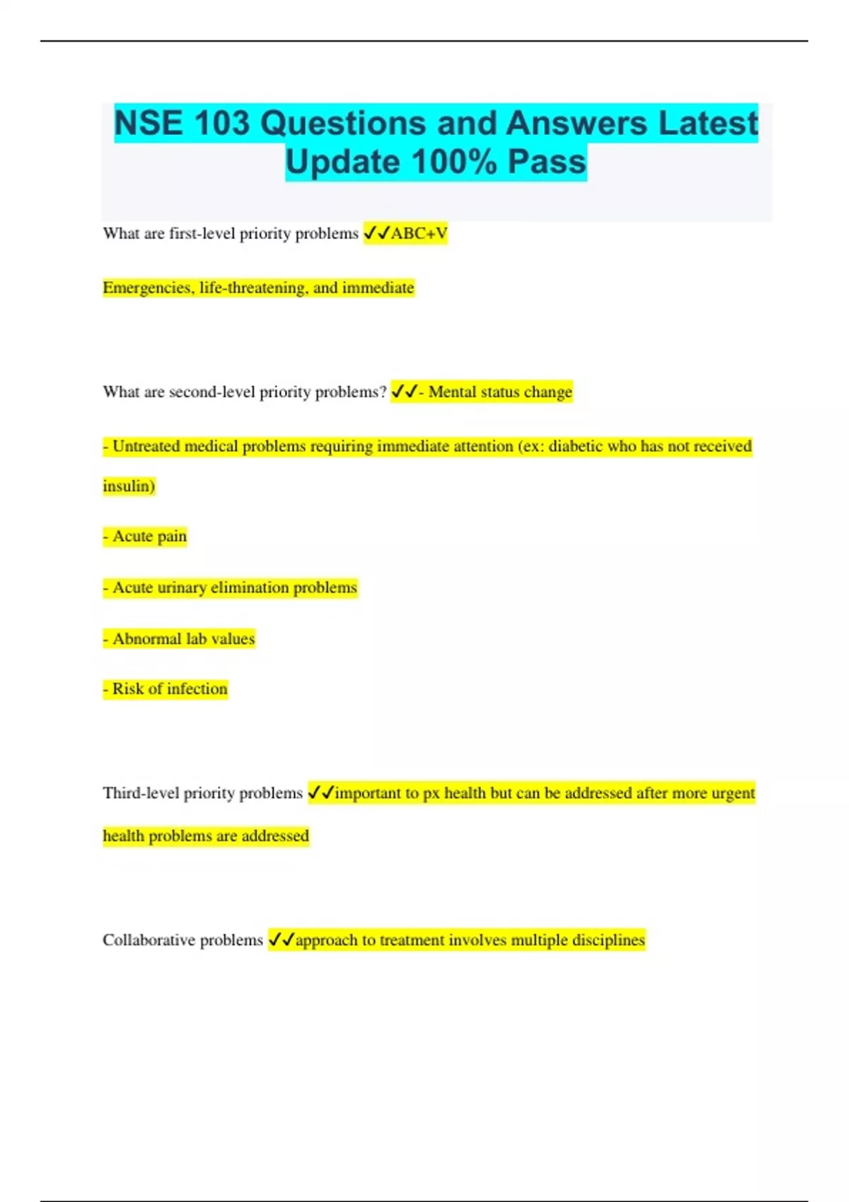 NSE 103 Questions and Answers Latest Update 100% Pass What are first-level priority problems ABC+V Emergencies, life-threatening, and immediate What are second-level priority problems? - Mental status change - Untreated medical problems requiring immediate attention (ex: diabetic who has not received insulin) - Acute pain - Acute urinary elimination problems - Abnormal lab values - Risk of infection Third-level priority problems important to px health but can be addressed after more urgent health problems are addressed Collaborative problems approach to treatment involves multiple disciplines What is the behavioural model? health care extends beyond treating disease to include secondary and primary preventions, with emphasis on changing behaviours and lifestyles What is the socio-environmental model Incorporates sociological and environmental aspects in addition to the biomedial and behavioural ones - social determinants of health & health promo What is a relational approach to nursing? refers to the fact that health, illness, and the meanings they hold for a person are shaped by the person's relations/intersections What are 4 types of data collection? 1. complete 2. episodic/problem-centered 3. follow up 4. emergency What is a complete data set? complete health history full physical exam Describes current and past health states and forms a baseline against which all future changes can be measured What is an episodic/problem centered Database - For a limited or short term problem small in scope, and more focused than the complete database -concerns mainly one problem, one cue complex, or one body system What is a follow-up database? Status of any ID problem should be evaluated at regular intervals What is an emergency database? Rapid collection of the data often compiled while life-saving measures are occuring What are 3 levels of disease prevention? Primary Secondary Tertiary What are characteristics of primary disease prevention? - sanitation and immunization People and populations are prevented from becoming ill, sick, or injured in the first place What are characteristics of secondary disease prevention? Early detection of disease What are characteristics of tertiary disease prevention? Prevention of complications when a condition or disease is present or has progressed What is cachexia? extreme wasting and malnutrition How should you palpate for temperature? Dorsal aspect of hand Which part of the hand should be used to feel for vibration or pulsatility? Metacarpophalangeal joints What