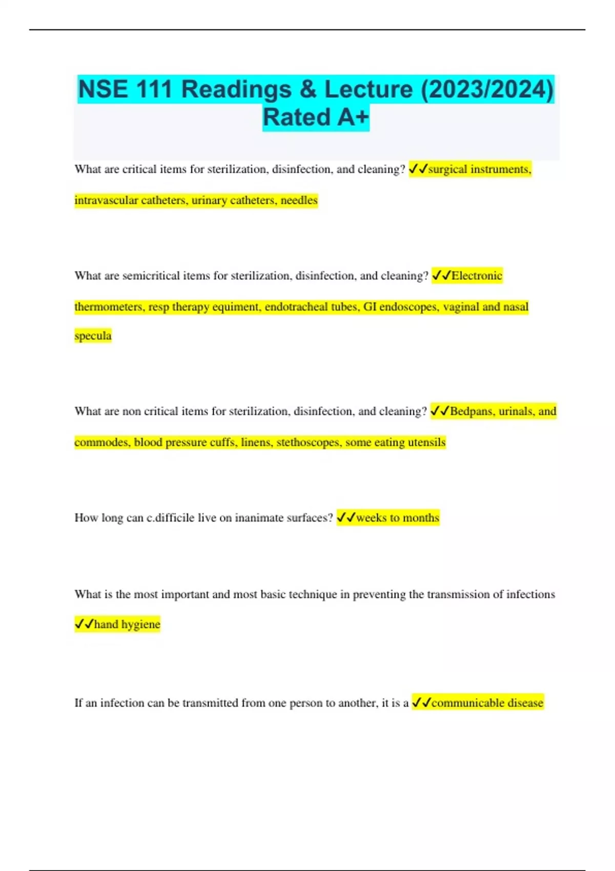 NSE 111 Readings & Lecture (2023/2024) Rated A+ What are critical items for sterilization, disinfection, and cleaning? surgical instruments, intravascular catheters, urinary catheters, needles What are semicritical items for sterilization, disinfection, and cleaning? Electronic thermometers, resp therapy equiment, endotracheal tubes, GI endoscopes, vaginal and nasal specula What are non critical items for sterilization, disinfection, and cleaning? Bedpans, urinals, and commodes, blood pressure cuffs, linens, stethoscopes, some eating utensils How long can cile live on inanimate surfaces? weeks to months What is the most important and most basic technique in preventing the transmission of infections hand hygiene If an infection can be transmitted from one person to another, it is a communicable disease The mode of transmission for methicillin-resistant Staphylococcus aureus (MRSA) is: Direct and indirect contact The interval when a patient manifests signs and symptoms specific to a type of infection is the... Illness stage The most important and basic way to break the chain of infection is by Practicing hand hygiene The minimum handwashing time with soap and water necessary to remove most transient microorganisms is 40-60 seconds A px is on iso precautions for pulmonary TB. The nurse notes that the px seems to be angry but knows this is a normal response to iso. The nurse's best intervention is Explain the isolation procedures and provide meaningful stim A gown should be worn when Blood or body fluids may get on the nurse's clothing from a task the nurse plans to perform You have dressed a px wound and now plan to administer a medication (which is currently in the room) to the px. It is important ot Remove your gloves and perform hand hygiene before administering the medication A px on your unit develops diarrhea, which is confirmed to be caused by C.Diff. What type of iso should this px be placed on? Contact precautions When performing surgical hand hygiene, the nurse's hands must be kept Above the elbows 5 steps of the nursing process 1. Assessment 2. Diagnosis 3. Planning 4. Implementation 5. Evaluation What are the 5 stages of change? 1. Pre-contemplation 2. Contemplation 3. Preparation 4. Action 5. Maintenance Define precontemplation unaware of need for change and has no intention of changing behaviours Define contemplation Aware of need to change and intends to change behaviour sometime in the future Define preparation Alters behaviours in minor ways with the intention to make substantive changes in the immediate future Define action Modifies behaviours and experiences in order to make sustainable change Define maintenance focuses on not reverting to previous