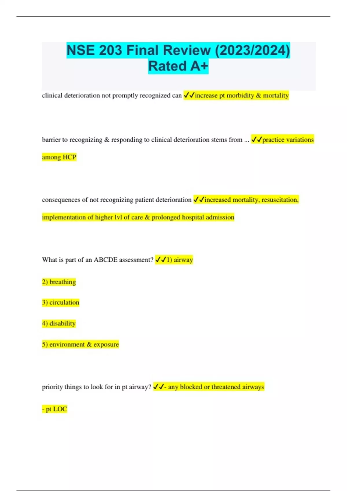 NSE 203 Final Review (2023/2024) Rated A+ clinical deterioration not promptly recognized can increase pt morbidity & mortality barrier to recognizing & responding to clinical deterioration stems from ... practice variations among HCP consequences of not recognizing patient deterioration increased mortality, resuscitation, implementation of higher lvl of care & prolonged hospital admission What is part of an ABCDE assessment? 1) airway 2) breathing 3) circulation 4) disability 5) environment & exposure priority things to look for in pt airway? - any blocked or threatened airways - pt LOC - abnormal respiratory assessment findings (ex; stridor) if you suspect neurological trauma when assessing airway you ... start w/ triple airway maneuver!! Triple airway manoeuvre chin lift, jaw thrust, patient oxygen what does vital sign instability & visible patient deterioration tend to occur? in most pts from 6-24 hrs before cardiac arrest clinical deterioration patient compromising *hemodynamic stability, marked by physiological decompensation* accompanied by subjective or objective findings. dynamic state variations in physiological parameters decompensation inability to maintain homeostatic fxn physiologically or psychologically what are indicators of clinical deterioration - sudden and/or unstable changes in vital signs (RR, BP, HR, O2) - for expert nurses, their intuition helps them determine if a patient looks right - skin color changes - decreased LOC assessments to recognize deterioration ABCDE NEWS2 FAST signs during primary survey that are *significantly associated w/ death* ... - partial airway obstruction - poor peripheral circulation - greater than expected drain fluid loss - decreased UO - decreased GCS - abnormal RR - new pain - low O2sat & low BP - alteration in mentation NEWS2 aka national early warning score purpose of NEWS2 - improve detection of & response to clinical deterioration in patients w/ acute illness - provide *standardized approach* to care of deteriorating patient - clear communication - identify a *score* for urgent clinical response what does the NEWS2 score mean? *a high NEWS2 score* identifies a sick patient who is deteriorating & requires *urgent clinical review* what does NEWS2 score evaluate? - RR - O2 Sat - systolic BP - HR - LOC or new confusion - temp what to do if NEWS score is greater or equal to 3 discuss w/ duty nurse/senior colleague, & complete a *sepsis screen for signs of infection* what to do if NEWS score is greater or equal to 6 immediate