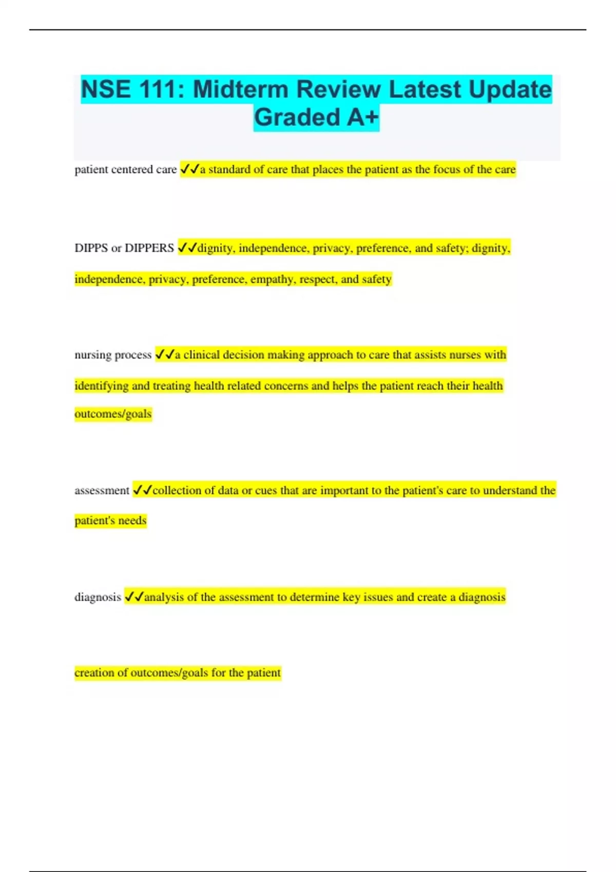 NSE 111: Midterm Review Latest Update Graded A+ patient centered care a standard of care that places the patient as the focus of the care DIPPS or DIPPERS dignity, independence, privacy, preference, and safety; dignity, independence, privacy, preference, empathy, respect, and safety nursing process a clinical decision making approach to care that assists nurses with identifying and treating health related concerns and helps the patient reach their health outcomes/goals assessment collection of data or cues that are important to the patient's care to understand the patient's needs diagnosis analysis of the assessment to determine key issues and create a diagnosis creation of outcomes/goals for the patient planning creation of a plan that identifies strategies to reach patient's health outcomes implementation carrying out the plan of care evaluation determining if the implementation of the plan was successful in reaching patient outcomes infections a disease state that results from the entry of a pathogen into the tissue of the host pathogen a microorganism that causes disease local limited to a specific part of the body systemic spreads throughout the entire body chain of infection infectious agent, reservoir, portal of exit, mode of transmission, portal of entry, susceptible host infectious agent pathogen that causes disease reservoir a site where pathogens can survive but may or may not multiple survival needs of pathogen food, water, pH level (5-8), minimal light, oxygen, and temperature between 35-37 degrees portal of exit the path by which the pathogen leaves the reservoir mode of transmission route of transmission by which the pathogen travel from the reservoir to host direct between infected individual and host (to skin) indirect between the host and contaminated object (intermediate object) airborne organism travel from respiratory system of infected source to host propelled through air farther than 1m (chicken pox, measles) droplet organism travels from respiratory system of infected source to host through air up to 2m (COVID-19) vehicle one contaminated source infects multiple hosts (water in Flint, MI) vectorborne microbes transmitted from insects to humans (West Nile virus) portal of entry the path by which the pathogen can enter the body (possibly through the same path used for exiting) susceptible host a person who gets an infection or disease defences against infection immune system, normal flora, inflammatory response, body system defence factors that affect patient susceptibility age, nutritional intake, stress, and medication Health care associated infection An infection that is acquired after admission that is not present or incubating at the time of admission aspesis keeping away disease-producing microorganisms medical asepsis reduce and prevent the spread of microorganisms surgical aspesis Use of precise practices to eliminate all micro-organisms including pathogens and spores from an object or area routine practices used in the care of all patients regardless of their diagnosis or possible infection status breaking the chain of infection: infectious agent cleaning, disinfecting, sterilizing, and educating others to reduce or eliminate microorganisms breaking the chain of infection: reservoir eliminating or controlling sources of body fluid that might harbour microorganisms (ex. changing dressings) breaking the chain of infection: portal exit avoiding talking, coughing, or sneezing over open wounds or sterile fields, covering the mouth and nose when coughing or sneezing wearing a mask handling of blood and fluids correct disposal of soiled items breaking the chain of infection: modes of transmission be knowledgeable of modes of transmission appropriate hand hygiene don't share equipment hold soiled linen away from the body breaking the chain of infection: portal of entry maintain patient's skin integrity implement strategies for susceptible skin hygiene correct disposal of soiled linens breaking the chain of infection: susceptible host maintaining patient's skin integrity adequate fluid and diet maintaining immunization regular hygiene soap and water physical removal of microbes using friction if hands are visibly soiled, exposed to C. diff or alcohol-based hand rub is not available alcohol-based hand rub better than soap and water; excellent steps of hand washing 1. Turn on water 2. Wet hands 3. Apply soap 4. Later soap for 20+ seconds 5. Palms, interlaced fingers, knuckles 6. Each thumb and crease 7. Wrist 8. Rinse hands separately pointing down towards sink basin 9. Get paper towel and dry hands (leave water on) 10. Get another paper towel and turn off water steps to alcohol-based hand rub 1. apply 1-2 pumps 2. rub for 20+ seconds or until dry 3. palms, interlaced fingers, knuckles, etc. 4. thumb and pinky personal protective equipment a barrier between a person and pathogens; includes gloves, gowns, masks, and goggles gown prevents contamination of uniform and clothing gloves handwear worn to prevent transmission of pathogens by direct or indirect contact but DOES NOT REPLACE HAND HYGIENE mask and goggles protects eyes, nose, and mouth from splashes of body fluids donning PPE 1. hand hygiene 2. gown 3. mask 4. goggle 5. gloves doffing PPE 1. gloves 2. gown 3. hand hygiene 4. goggles 5. mask 6. hand hygiene Tier 2 of isolation precautions contact: private or cohort room, hand hygiene, and gown with gloves for direct care droplets: private or cohort rooms, hand hygiene, mask, and goggles airborne: N95 mask, hand hygiene, private room with door kept closed and negative air flow systems involved in movement Skeletal Muscular Nervous body alignment relationship of one body part to another along a horizontal or vertical line body balance when the centre of gravity is balanced over a stable base of support; enhanced by posture gait manner of walking gravity A force that exerts a downward force on the body friction occurs in a direction to oppose movement body mechanics 