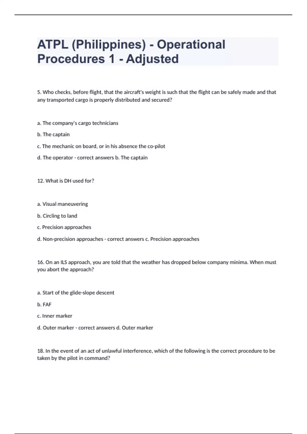 ATPL (Philippines) - Operational Procedures 1 - Adjusted5. Who checks, before flight, that the aircraft's weight is such that the flight can be safely made and that any transported cargo is properly distributed and secured? a. The company's cargo technicians b. The captain c. The mechanic on board, or in his absence the co-pilot d. The operator - correct answers b. The captain 12. What is DH used for? a. Visual maneuvering b. Circling to land c. Precision approaches d. Non-precision approaches - correct answers c. Precision approaches 16. On an ILS approach, you are told that the weather has dropped below company minima. When must you abort the approach? a. Start of the glide-slope descent b. FAF c. Inner marker d. Outer marker - correct answers d. Outer marker 18. In the event of an act of unlawful interference, which of the following is the correct procedure to be taken by the pilot in command?