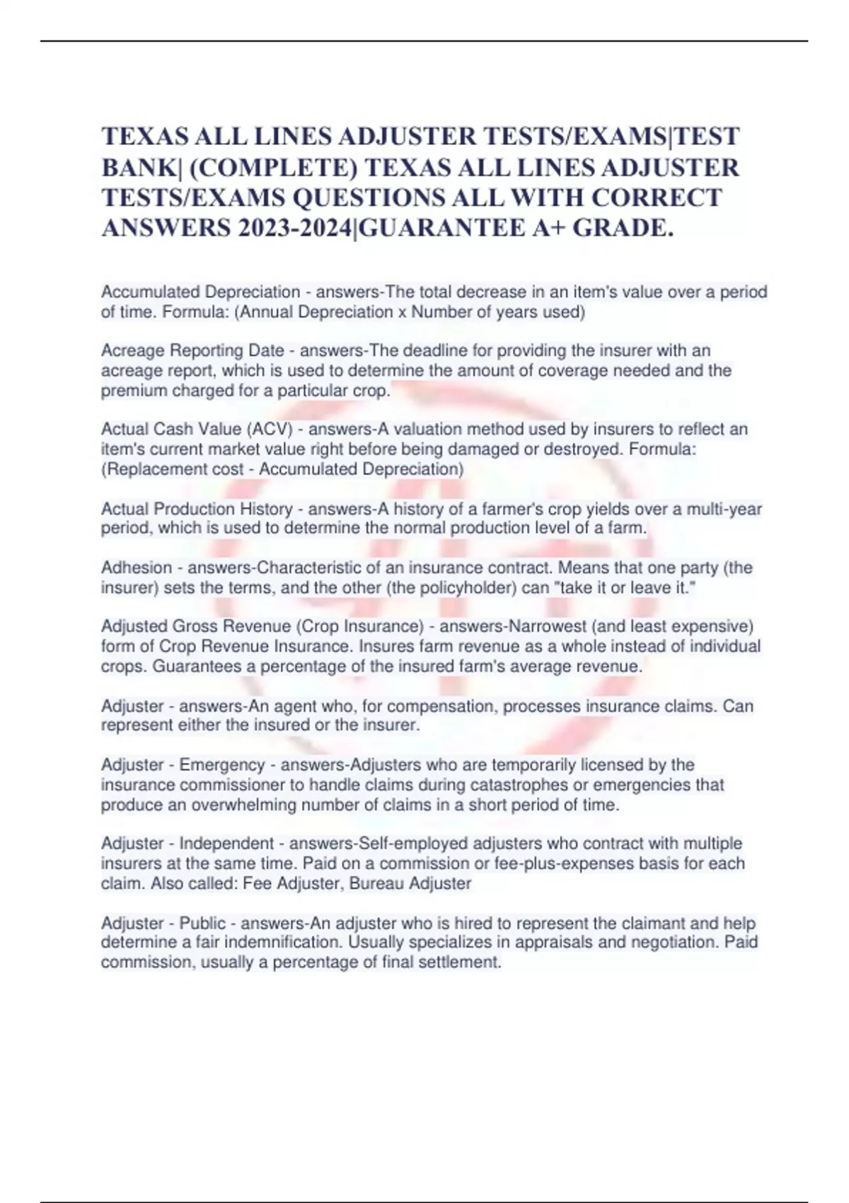 TEXAS ALL LINES ADJUSTER TESTS/EXAMS|TEST BANK| (COMPLETE) TEXAS ALL LINES ADJUSTER TESTS/EXAMS QUESTIONS ALL WITH CORRECT ANSWERS |GUARANTEE A+ GRADE