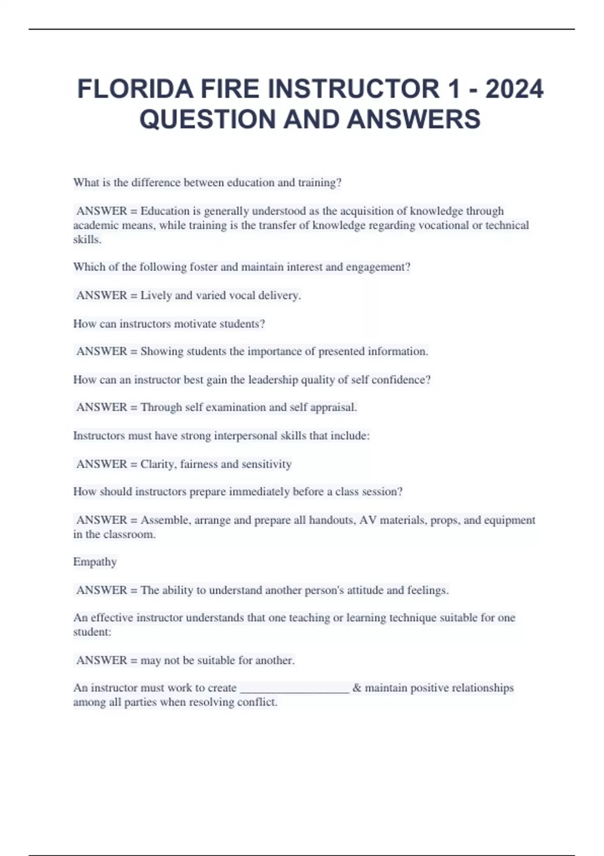 FLORIDA FIRE INSTRUCTOR 1 - 2024 QUESTION AND ANSWERS
