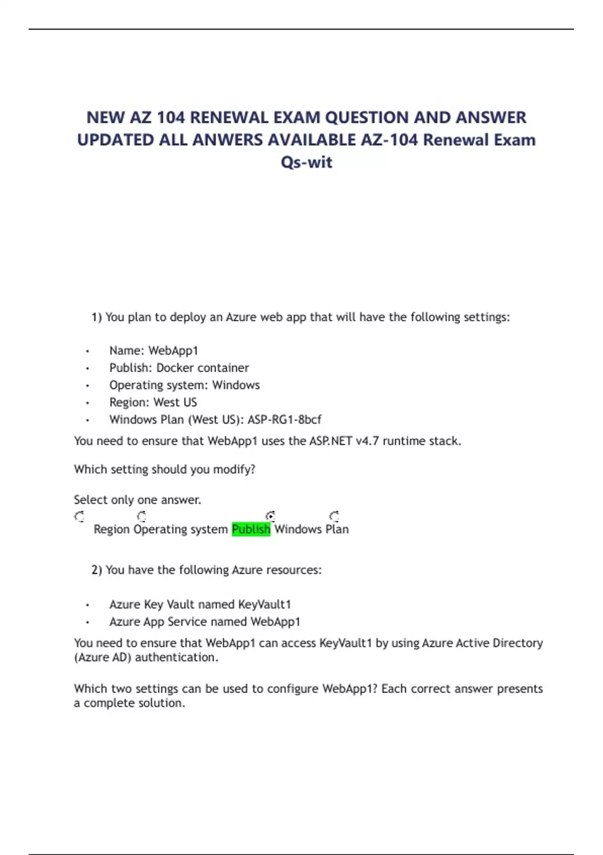 NEW AZ 104 RENEWAL EXAM QUESTION AND ANSWER UPDATED ALL ANWERS AVAILABLE AZ-104 Renewal Exam Qs-wit