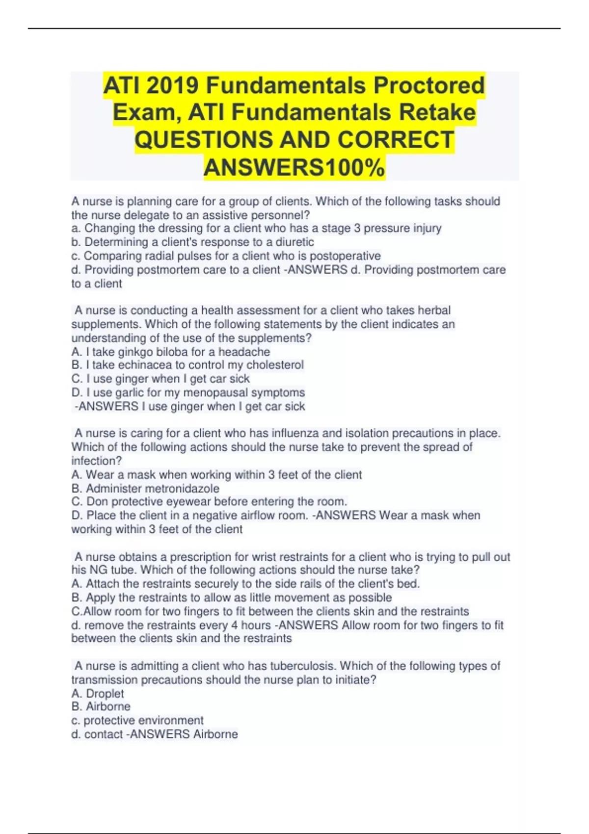 ATI 2019 Fundamentals Proctored Exam, ATI Fundamentals Retake QUESTIONS AND CORRECT ANSWERS100% A nurse is planning care for a group of clients. Which of the following tasks should the nurse delegate to an assistive personnel? a. Changing the dressing for a client who has a stage 3 pressure injury b. Determining a client's response to a diuretic c. Comparing radial pulses for a client who is postoperative d. Providing postmortem care to a client -ANSWERS d. Providing postmortem care to a client A nurse is conducting a health assessment for a client who takes herbal supplements. Which of the following statements by the client indicates an understanding of the use of the supplements? A. I take ginkgo biloba for a headache B. I take echinacea to control my cholesterol C. I use ginger when I get car sick D. I use garlic for my menopausal symptoms -ANSWERS I use ginger when I get car sick A nurse is caring for a client who has influenza and isolation precautions in place. Which of the following actions should the nurse take to prevent the spread of infection? A. Wear a mask when working within 3 feet of the client B. Administer metronidazole C. Don protective eyewear before entering the room. D. Place the client in a negative airflow room. -ANSWERS Wear a mask when working within 3 feet of the client A nurse obtains a prescription for wrist restraints for a client who is trying to pull out his NG tube. Which of the following actions should the nurse take? A. Attach the restraints securely to the side rails of the client's bed. B. Apply the restraints to allow as little movement as possible C.Allow room for two fingers to fit between the clients skin and the restraints d. remove the restraints every 4 hours -ANSWERS Allow room for two fingers to fit between the clients skin and the restraints A nurse is admitting a client who has tuberculosis. Which of the following types of transmission precautions should the nurse plan to initiate? A. Droplet B. Airborne c. protective environment d. contact -ANSWERS Airborne A nurse in a well-child clinic receives a telephone call from a parent who states that their child accidentally swallowed paint thinner. The child is awake and alert. Which of the following responses should the nurse make? A. Have your child drink one large glass of water. B. Hang up and call a poison control center hotline. C. Bring your child into the clinic later today. D. Induce vomiting in your child with syrup of ipecac. -ANSWERS Have your child drink one large glass of water A nurse is documenting a client's medical record. Which of the following entries should the nurse record. A. Oral temperature slightly elevated at 0800 B. Administered pain medication C. Incision without redness or drainage D. Drank adequate amounts of fluid with meals. -ANSWERS Administered pain medication A nurse is providing oral care for a client who is unconscious. Which of the following actions should the nurse take? A. Place the client in a side-lying position. B. Brush the clients teeth daily C. Apply mineral oil to the client's lips D. Rinse the client's mouth with an alcohol-based mouthwash -ANSWERS Place the client in a side-lying position A nurse is collaborating with a risk management team about potential legal issues involving client care. The nurse should identify which of the following situations is an example of negligence? A. A nurse administers a medication without first identifying the client. B. An assistive personnel discusses client care in the facility cafeteria with visitors present. C. A nurse begins a blood transfusion without obtaining consent. D. An assistive personnel prevents a client from leaving the facility. -ANSWERS A nurse begins a blood transfusion without obtaining consent A nurse is collecting a sputum specimen for culture from a client who has a respiratory infection. Which of the following actions should the nurse take? A. Wear sterile gloves when collecting the specimen. B. Offer the client oral hygiene after the collection C. Collect the specimen in the evening. D Collect 1 ml of sputum. -ANSWERS Offer the client oral hygiene after the collection A nurse is assessing an older client. Which of the following findings should the nurse expect? a. Decreased sense of balance b. Increased nighttime sleeping c. Heightened sense of pain d. Nighttime urinary incontinence -ANSWERS Decreased sense of balance A nurse is completing discharge teaching about ostomy care with a client who has a new stoma. Which of the following instructions should the nurse include in the teaching? (select all that apply) a. "Cut the opening of the pouch 1⁄8 of an inch larger than the stoma " b. "Place a piece a gauze over the stoma while changing the pouch" c. "Use povidone-iodine to clean around the stoma" d. "Empty the ostomy pouch when it becomes one-third full of contents" e. expect the stoma to turn a purple-blue color as its heals" -ANSWERS Cut the opening of the pouch 1⁄8 of an inch larger than the stoma Place a piece a gauze over the stoma while changing the pouch Use povidone-iodine to clean around the stoma Empty the ostomy pouch when it becomes one-third full of contents A nurse is preparing to obtain informed consent from a client who speaks a different language than the nurse. Which of the following actions should the nurse take? a. "Request that an assistive personnel interpret the information for the client" b. "Use proper medical terms when giving information to the client" c. "Offer written information in the client's language" d. "Avoid using gestures when speaking to the client" -ANSWERS Offer written information in the client's language A nurse is teaching a client about home care equipment. Which of the following information should the nurse include in the teaching? (select all that apply) a. "Avoid using wool blankets when receiving oxygen" b. check the O2 delivery rate at least once a day c. align the middle of the ball in the flow meter with the line of the prescribed flow
