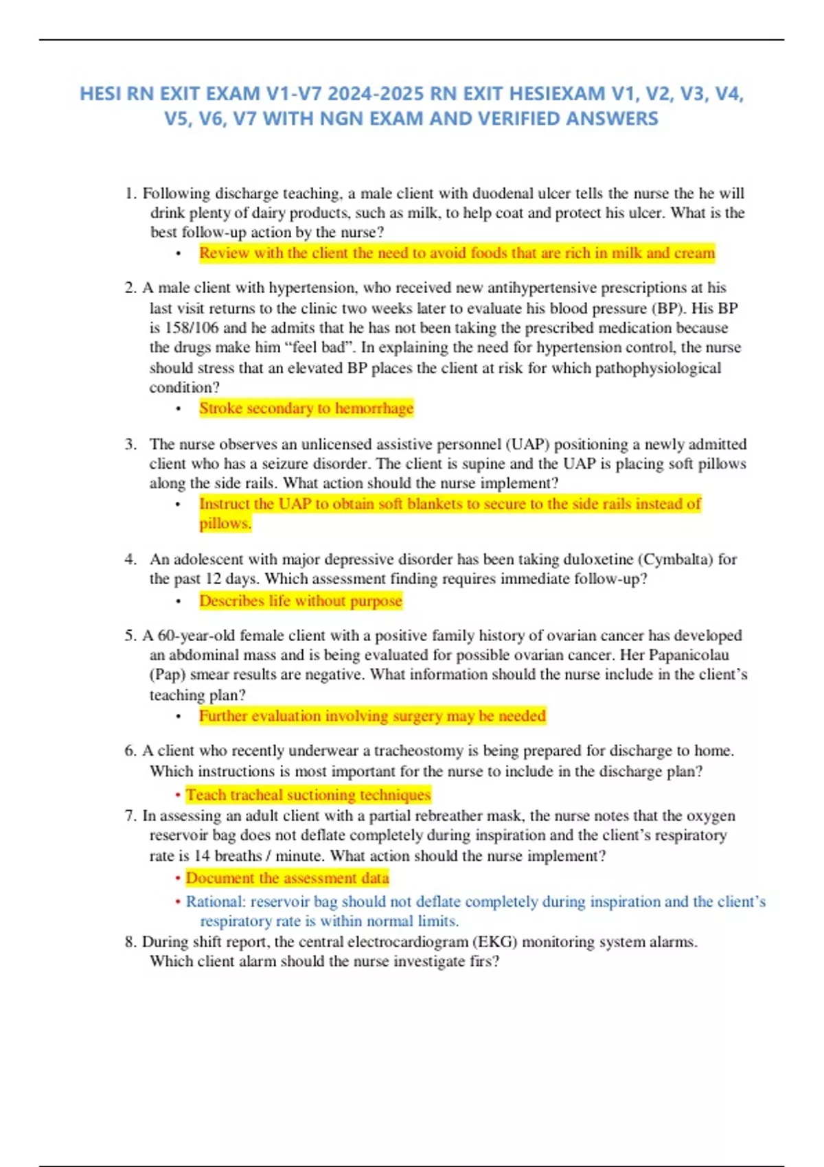 HESI RN EXIT EXAM V1-V RN EXIT HESIEXAM V1, V2, V3, V4, V5, V6, V7 WITH NGN EXAM AND VERIFIED ANSWERS