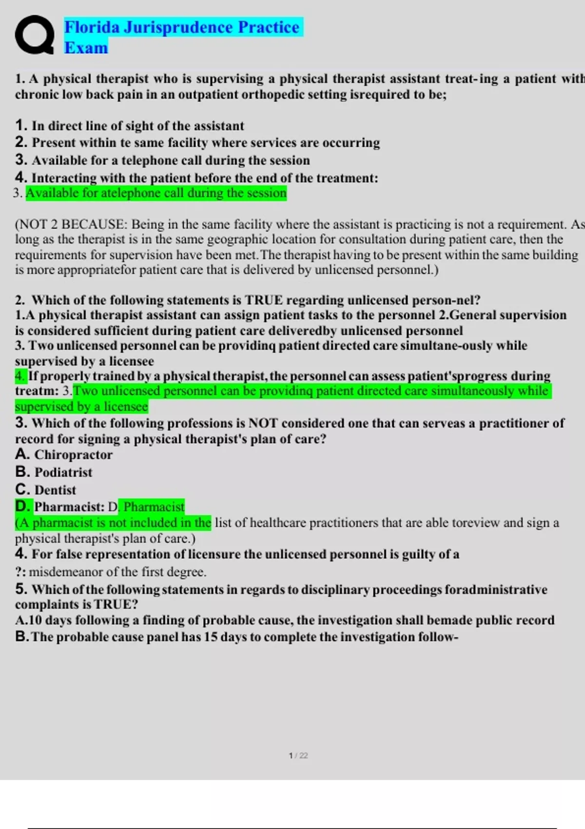 Florida Jurisprudence Practice Exam. Questions and 100% correct answers. Already graded A+ 1.A physical therapist who is supervising a physical therapist assistant treat- ing a patient with chronic low back pain in an outpatient orthopedic setting is required to be; 1.In direct line of sight of the assistant 2.Present within te same facility where services are occurring 3.Available for a telephone call during the session 4.Interacting with the patient before the end of the treatment: 3. Available for a telephone call during the session (NOT 2 BECAUSE: Being in the same facility where the assistant is practicing is not a requirement. As long as the therapist is in the same geographic location for consultation during patient care, then the requirements for supervision have been met. The therapist having to be present within the same building is more appropriate for patient care that is delivered by unlicensed personnel.) 2.Which of the following statements is TRUE regarding unlicensed person- nel? 1.A physical therapist assistant can assign patient tasks to the personnel 2.General supervision is considered sufficient during patient care delivered by unlicensed personnel 3.Two unlicensed personnel can be providinq patient directed care simultane- ously while supervised by a licensee 4.If properly trained by a physical therapist, the personnel can assess patient's progress during treatm: 3.Two unlicensed personnel can be providinq patient directed care simultaneously while supervised by a licensee