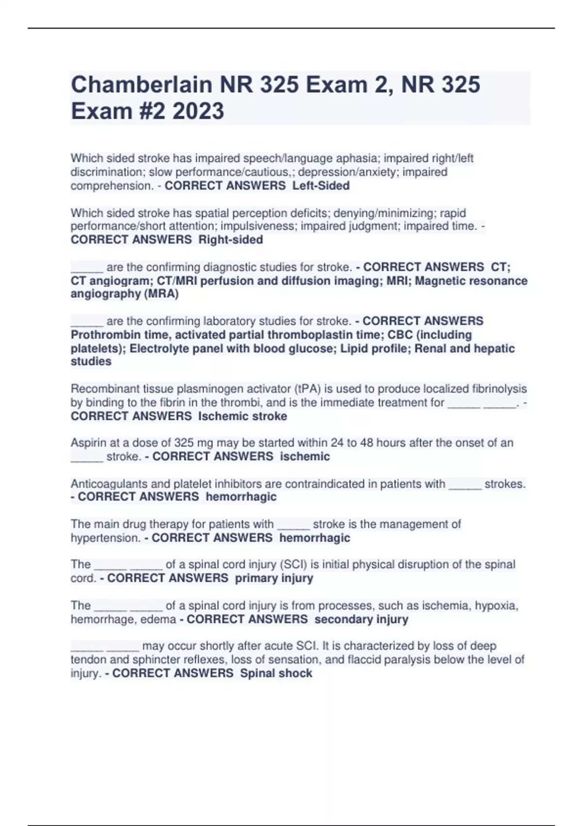 Chamberlain NR 325 Exam 2, NR 325 Exam #2 2023 Which sided stroke has impaired speech/language aphasia; impaired right/left discrimination; slow performance/cautious,; depression/anxiety; impaired comprehension. - CORRECT ANSWERS Left-Sided Which sided stroke has spatial perception deficits; denying/minimizing; rapid performance/short attention; impulsiveness; impaired judgment; impaired time. - CORRECT ANSWERS Right-sided _____ are the confirming diagnostic studies for stroke. - CORRECT ANSWERS CT; CT angiogram; CT/MRI perfusion and diffusion imaging; MRI; Magnetic resonance angiography (MRA) _____ are the confirming laboratory studies for stroke. - CORRECT ANSWERS Prothrombin time, activated partial thromboplastin time; CBC (including platelets); Electrolyte panel with blood glucose; Lipid profile; Renal and hepatic studies Recombinant tissue plasminogen activator (tPA) is used to produce localized fibrinolysis by binding to the fibrin in the thrombi, and is the immediate treatment for _____ _____. - CORRECT ANSWERS Ischemic stroke Aspirin at a dose of 325 mg may be started within 24 to 48 hours after the onset of an _____ stroke. - CORRECT ANSWERS ischemic Anticoagulants and platelet inhibitors are contraindicated in patients with _____ strokes. - CORRECT ANSWERS hemorrhagic The main drug therapy for patients with _____ stroke is the management of hypertension. - CORRECT ANSWERS hemorrhagic The _____ _____ of a spinal cord injury (SCI) is initial physical disruption of the spinal cord. - CORRECT ANSWERS primary injury The _____ _____ of a spinal cord injury is from processes, such as ischemia, hypoxia, hemorrhage, edema - CORRECT ANSWERS secondary injury _____ _____ may occur shortly after acute SCI. It is characterized by loss of deep tendon and sphincter reflexes, loss of sensation, and flaccid paralysis below the level of injury. - CORRECT ANSWERS Spinal shock _____ _____ involvement results in total loss of sensory and motor function below the level of injury. - CORRECT ANSWERS Complete cord _____ _____ involvement results in a mixed loss of voluntary motor activity and sensation and leaves some tracts intact. - CORRECT ANSWERS Incomplete cord SCI at C1-C3 - CORRECT ANSWERS Often fatal; Movement in neck and above, loss of innervation to diaphragm, absence of independent respiratory function SCI at C4 - CORRECT ANSWERS Sensation and movement in neck and above; May be able to breathe without ventilator SCI at C5 - CORRECT ANSWERS Full neck, partial shoulder, back, biceps; Gross elbow, inability to roll over or use hands; ↓ Respiratory reserve SCI at C6 - CORRECT ANSWERS Shoulder and upper back abduction and rotation at shoulder; Full biceps to elbow flexion, wrist extension, weak grasp of thumb; ↓ Respiratory reserve SCI at C7-C8 - CORRECT ANSWERS All triceps to elbow extension, finger extensors and flexors; Good grasp with some decreased strength; ↓ Respiratory reserve SCI at T1-T6 - CORRECT ANSWERS Full innervation of upper extremities; Back, essential intrinsic muscles of hand; Full strength and dexterity of grasp; ↓ Trunk stability, decreased respiratory reserve SCI at T6-T12 - CORRECT ANSWERS Full, stable thoracic muscles and upper back; Functional intercostal muscles, resulting in ↑ respiratory reserve SCI at L1-L2 - CORRECT ANSWERS Varying control of legs and pelvis; Instability of lower back SCI at L3-L4 - CORRECT ANSWERS Quadriceps and hip flexors; Absence of hamstring function, flail ankles CT scan is the preferred imaging study to diagnose the location and degree of injury and the degree of _____ _____ _____. - CORRECT ANSWERS spinal canal compromise _____ is used to assess soft tissue injury, neurologic changes, unexplained neurologic deficits, or worsening neurologic condition in SCI. - CORRECT ANSWERS MRI Goals immediately after _____ include maintaining a patent airway, adequate ventilation/breathing, and adequate circulating blood volume (ABCs) and preventing extension of spinal cord damage (secondary injury). - CORRECT ANSWERS SC