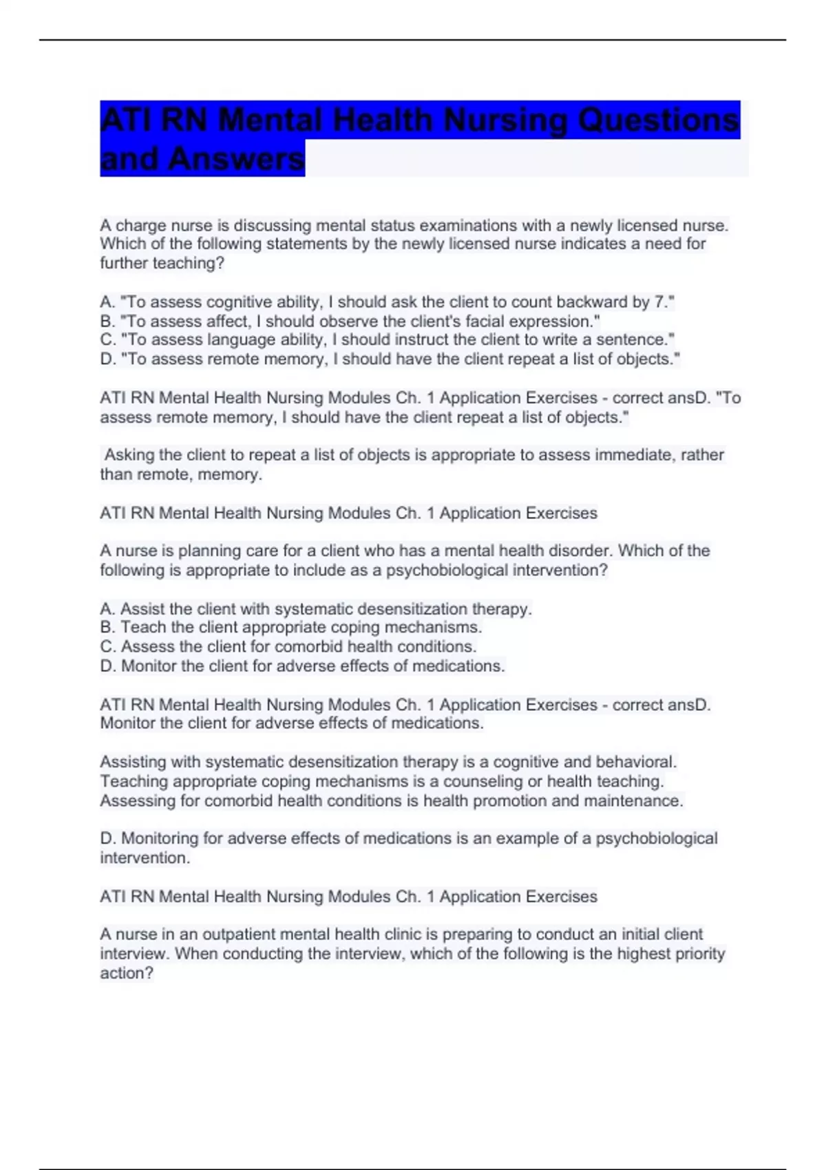 ATI RN Mental Health Nursing Questions and Answers already solved 2023