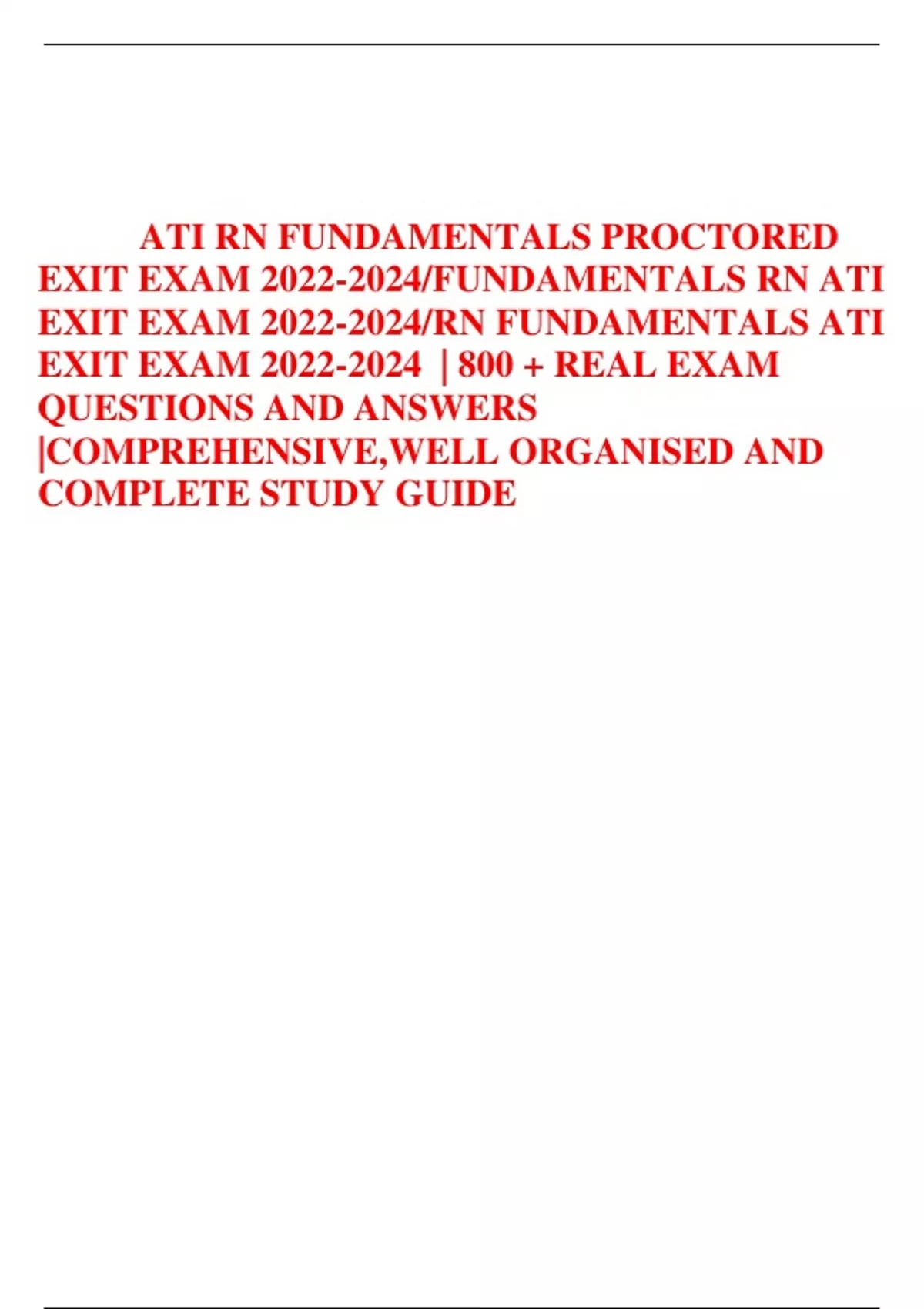 ATI RN FUNDAMENTALS PROCTORED EXIT EXAM /FUNDAMENTALS RN ATI EXIT EXAM /RN FUNDAMENTALS ATI EXIT EXAM | 800 + REAL EXAM QUESTIONS AND ANSWERS |COMPREHENSIVE,WELL ORGANISED AND COMPLETE STUDY GUIDE