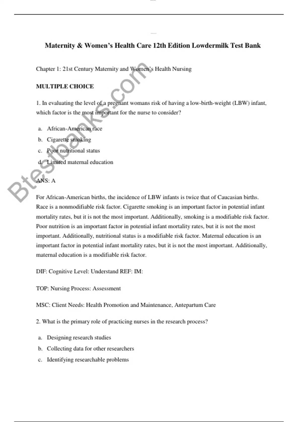 lOMoAR cPSD|34342408 lOMoAR cPSD|34342408 Maternity & Women’s Health Care 12th Edition Lowdermilk Test Bank Chapter 1: 21st Century Maternity and Women’s Health Nursing MULTIPLE CHOICE 1. In evaluating the level of a pregnant womans risk of having a low-birth -weight (LBW) infant, which factor is the most important for the nurse to consider? a. African -American race b. Cigarette smoking c. Poor nutritional status d. Limited maternal education ANS: A For African -American births, the incidence of LBW infants is twice that of Caucasian births. Race is a nonmodifiable risk factor. Cigarette smoking is an important factor in potential infant mortality rates, but it is not the most important. Additionally, smoking is a modifiable risk factor. Poor nutrition is an important factor in potential infant mortality rates, but it is not the most important. Additionally, nutritional status is a modifiable risk factor. Maternal education is an important factor in pot ential infant mortality rates, but it is not the most important. Additionally, maternal education is a modifiable risk factor. DIF: Cognitive Level: Understand REF: IM: TOP: Nursing Process: Assessment MSC: Client Needs: Health Promotion and Maintenance, Antepartum Care 2. What is the primary role of practicing nurses in the research process? a. Designing research studies b. Collecting data for other researchers c. Identifying researchable problems lOMoAR cPSD|34342408 d. Seeking funding to support research studies ANS: C When problems are identified, research can be properly conducted. Research of health care issues leads to evidence -based practice guidelines. Designing research studies is only one factor of the research process. Data collection is another factor of research. Financial support is necessary to conduct research, but it is not the primary role of the nurse in the research proce ss. DIF: Cognitive Level: Understand REF: im: 14 TOP: Nursing Process: N/A MSC: Client Needs: Safe and Effective Care Environment 3. A 23-year-old African -American woman is pregnant with her first child. Based on the statistics for infant mortality, which plan is most important for the nurse to implement? a. Perform a nutrition assessment. b. Refer the woman to a social worker. c. Advise the woman to see an obstetrician, not a midwife. d. Explain to the woman the importance of keeping her prenatal care appointments. ANS: D Consistent prenatal care is the best method of preventing or controlling risk factors associated with infant mortality. Nutritional status is an important modifiable risk factor, but it is not the most important action a nurse should take in this situation. The client may need assistance from a social worker at some time during her pregnancy, but a referral to a social worker is not the most important aspect the nurse should address at this time. If the woman has identifiable high -risk problems, the n her health care may need to be provided by a physician. However, it cannot be assumed that all African -American women have high -risk issues. In addition, advising the woman to see an obstetrician is not the most important aspect on which the nurse should focus at this time, and it is not appropriate for a nurse to advise or manage the type of care a client is to receive. DIF: Cognitive Level: Understand REF: IM: TOP: Nursing Process: Planning lOMoAR cPSD|34342408 MSC: Client Needs: Health Promotion and Maintenance 4. During a prenatal intake interview, the nurse is in the process of obtaining an initial assessment of a 21-year-old Hispanic client with limited English proficiency. Which action is the most important for the nurse to perform? a. Use maternity jargon to enable the client to become familiar with these terms. b. Speak quickly and efficiently to expedite the visit. c. Provide the client with handouts. d. Assess whether the client understands the discussion. ANS: D Nurses contribute to health literacy by using simple, common words, avoiding jargon, and evaluating whether the client understands the discussion. Speaking slowly and clearly and focusing on what is important will increase understanding. Most client education materials are written at a level too high for the average adult and may not be useful for a client with limited English proficiency. DIF: Cognitive Level: Apply REF: im: 5 TOP: Nursing Process: Evaluation MSC: Client Needs: Health Promotion and Maintenance 5. The nurses working at a newly established birthing center have begun to compare their performance in providing maternal -newborn care against clinical standards. This comparison process is most commonly known as what? a. Best practices network b. Clinical benchmarking c. Outcomes -oriented practice d. Evidence -based practice ANS: C lOMoAR cPSD|34342408 Outcomes -oriented practice measures the effectiveness of the interventions and quality of care against benchmarks or standards. The term best practice refers to a program or service that has been recognized for its excellence. Clinical benchmarking is a process used to compare ones own performance against the performance of the best in an area of service. The term evidence -based practice refers to the provision of care based on evidence gained through research and clinical trials. DIF: Cognitive Level: Understand REF: im: 11 TOP: Nursing Process: Evaluation MSC: Client Needs: Safe and Effective Care Environment 6. Which statement best exemplifies contemporary maternity nursing? a. Use of midwives for all vaginal deliveries b. Family -centered care c. Free-standing birth clinics d. Physician -driven care ANS: B Contemporary maternity nursing focuses on the familys needs and desires. Fathers, partners, grandparents, and siblings may be present for the birth and participate in activities such as cutting the babys umbilical cord. Both midwives and physicians perform vaginal deliveries. Free-standing clinics are an example of alternative birth options. Cont emporary maternity nursing is driven by th