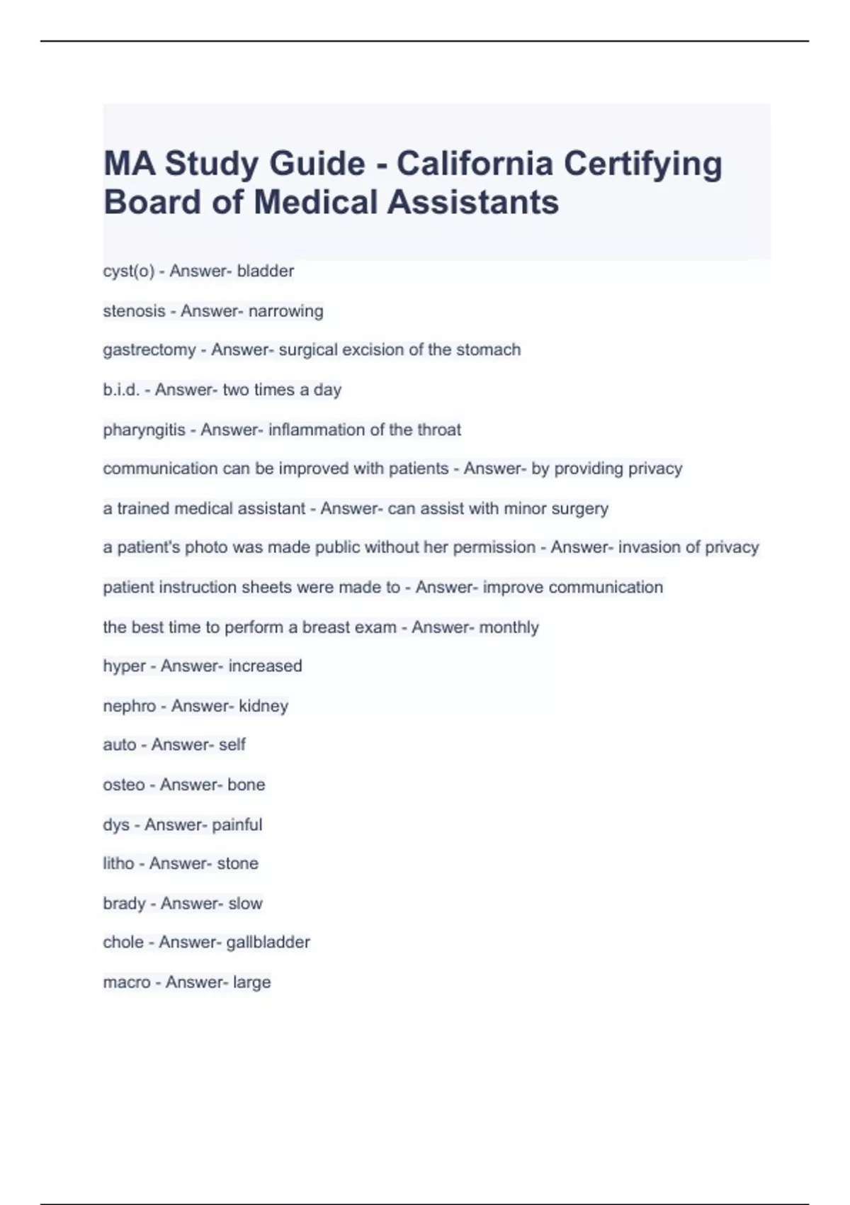 MA Study Guide - California Certifying Board of Medical Assistants Questions and Answers
