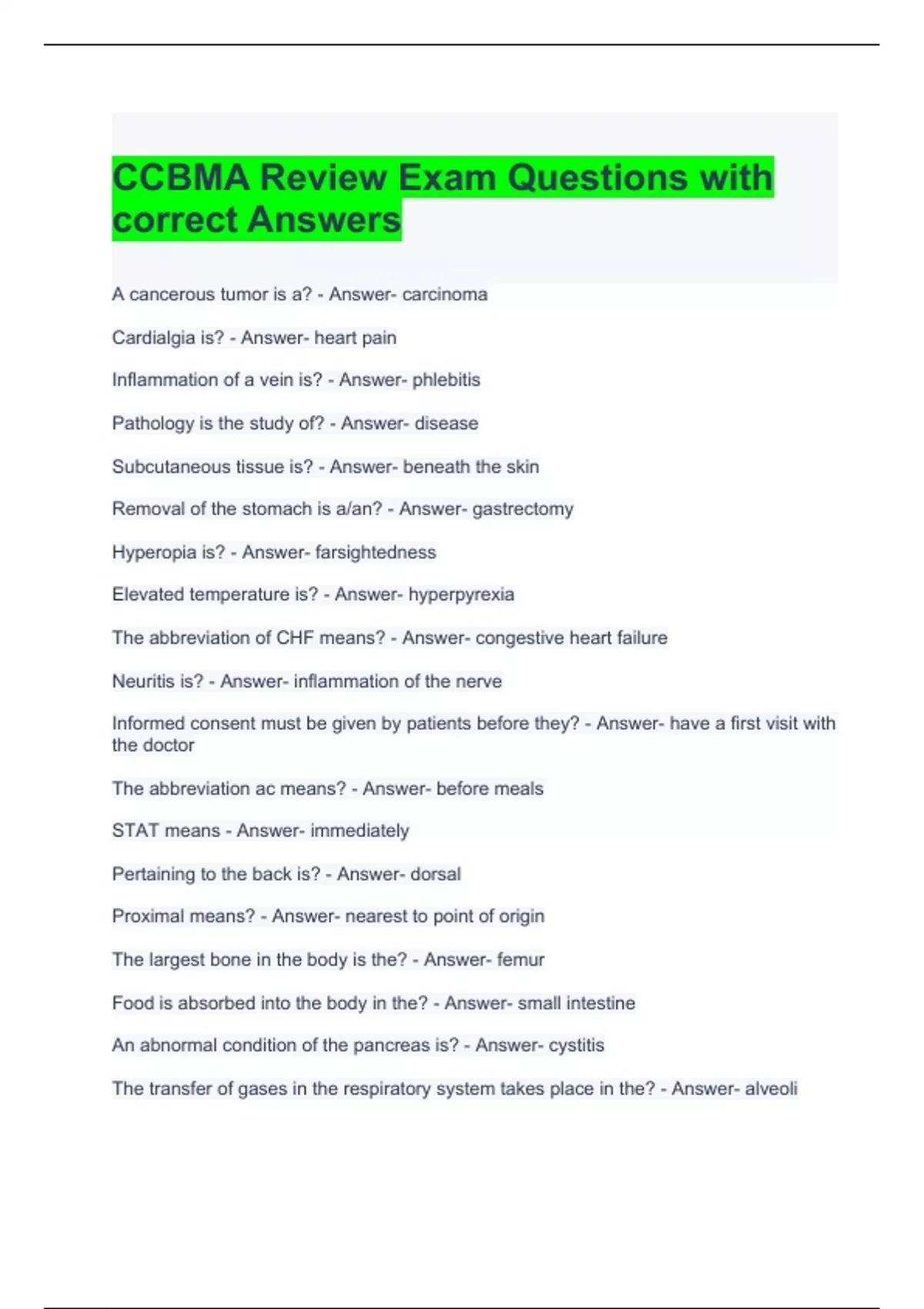 CCBMA Review Exam Questions with correct Answers.