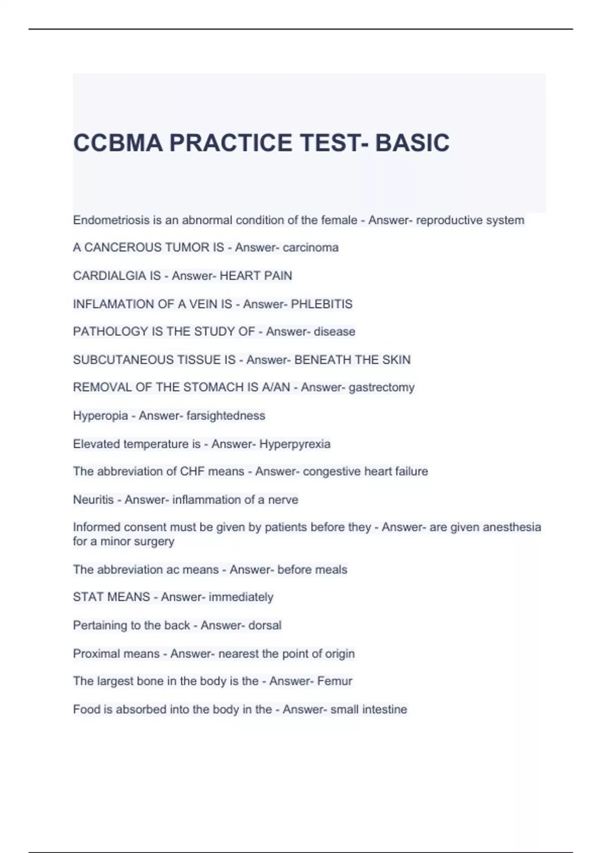 CCBMA PRACTICE TEST- BASIC QUESTIONS AND ANSWERS