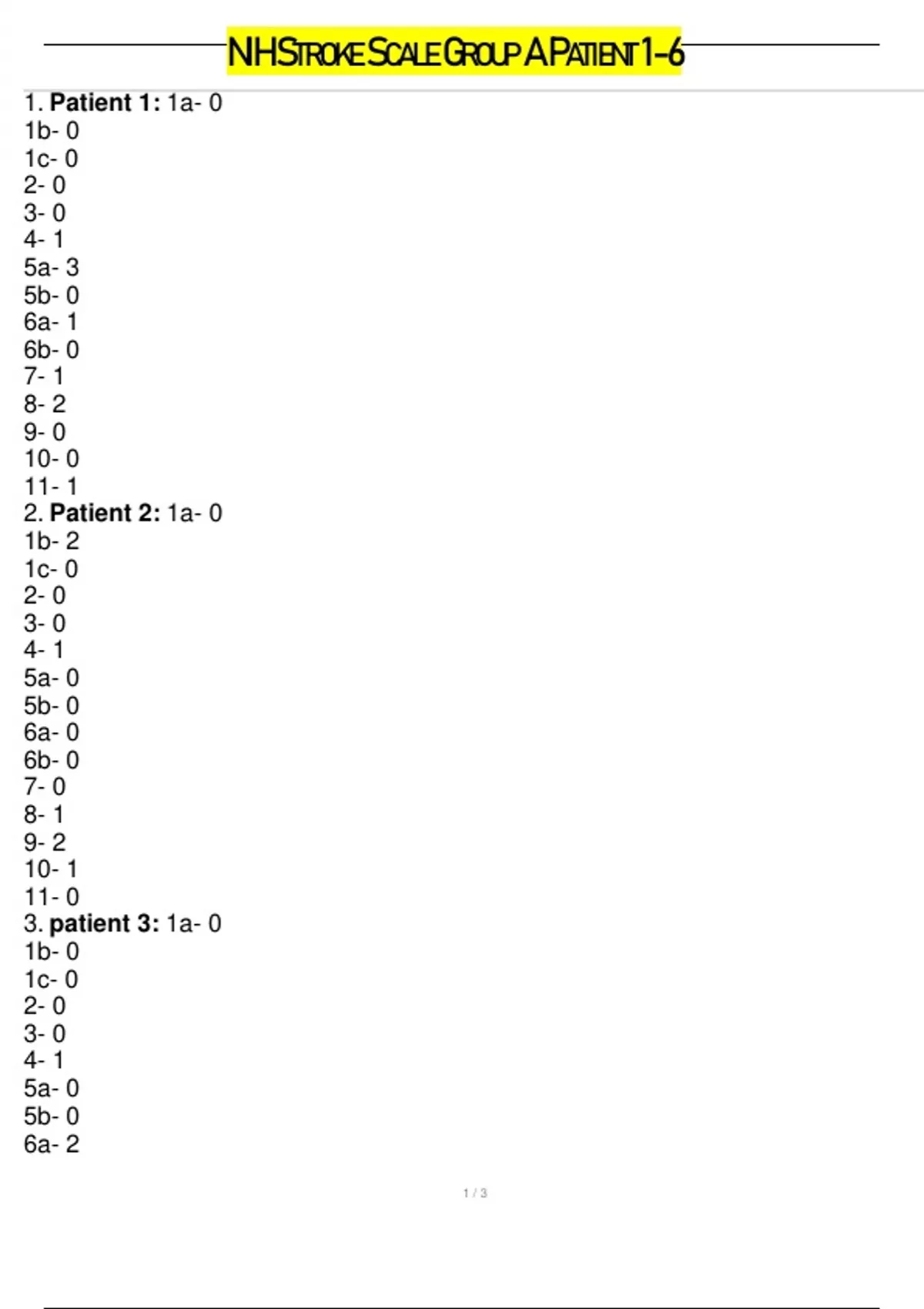 NIH STROKE SCALE GROUP A PATIENT 1-6 1. Patient 1: 1a- 0 1b- 0 1c- 0 2- 0 3- 0 4- 1 5a- 3 5b- 0 6a- 1 6b- 0 7- 1 8- 2 9- 0 10- 0 11- 1 2. Patient 2: 1a- 0 1b- 2 1c- 0 2- 0 3- 0 4- 1 5a- 0 5b- 0