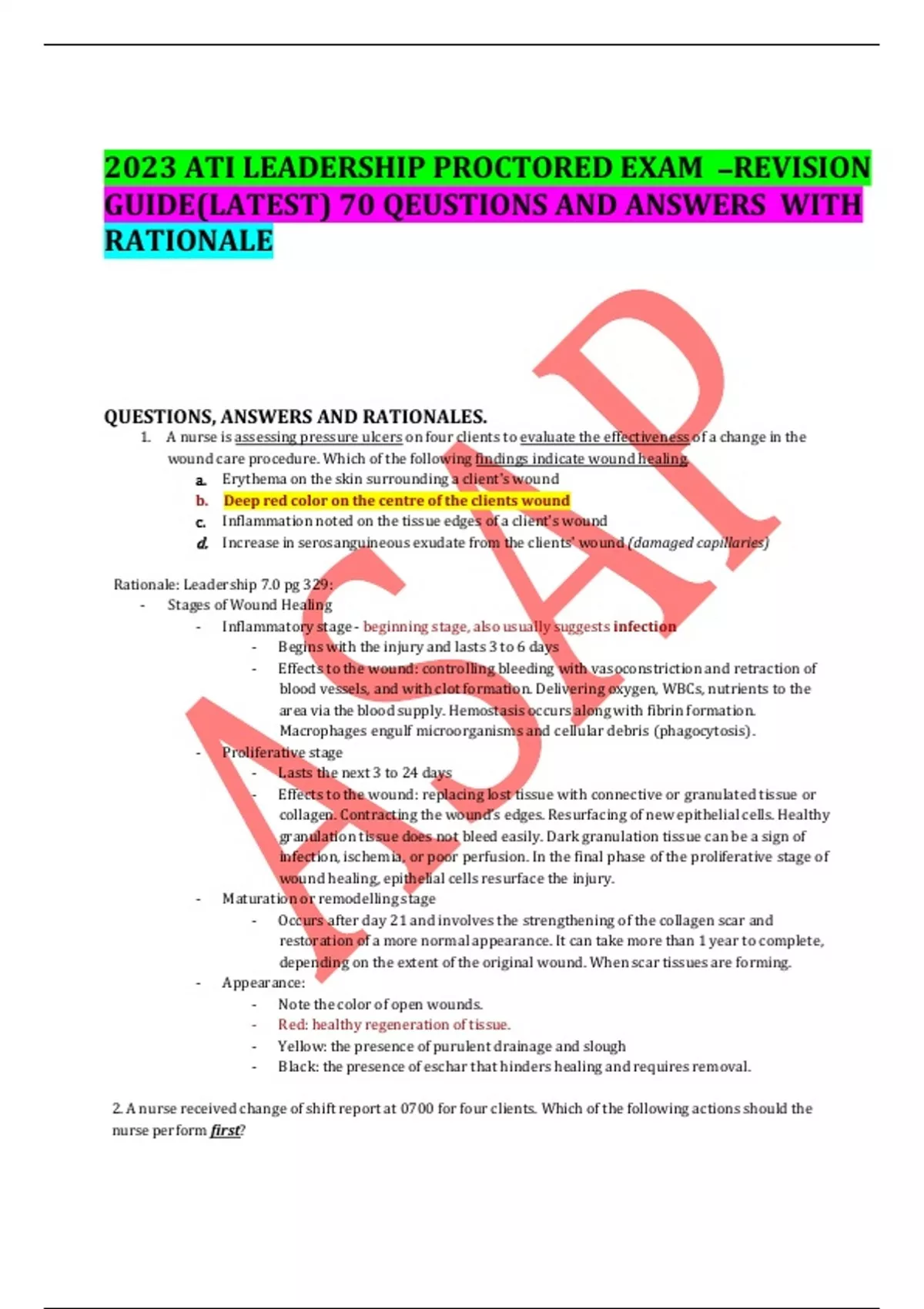 2023 ATI LEADERSHIP PROCTORED EXAM –REVISION GUIDE(LATEST) 70 QEUSTIONS AND ANSWERS WITH RATIONALE QUESTIONS, ANSWERS AND RATIONALES. 1. A nurse is assessing pressure ulcers on four clients to evaluate the effectiveness of a change in the wound care procedure. Which of the following findings indicate wound healing. a. Erythema on the skin surrounding a client's wound b. Deep red color on the centre of the clients wound c. Inflammation noted on the tissue edges of a client's wound d. Increase in serosanguineous exudate from the clients' wound (damaged capillaries) Rationale: Leadership 7.0 pg 329: - Stages of Wound Healing - Inflammatory stage - beginning stage, also usually suggests infection - Begins with the injury and lasts 3 to 6 days - Effects to the wound: controlling bleeding with vasoconstriction and retraction of blood vessels, and with clot formation. Delivering oxygen, WBCs, nutrients to the area via the blood supply. Hemostasis occurs along with fibrin formation. Macrophages engulf microorganisms and cellular debris (phagocytosis). - Proliferative stage - Lasts the next 3 to 24 days - Effects to the wound: replacing lost tissue with connective or granulated tissue or collagen. Contracting the wound’s edges. Resurfacing of new epithelial cells. Healthy granulation tissue does not bleed easily. Dark granulation tissue can be a sign of infection, ischemia, or poor perfusion. In the final phase of the proliferative stage of wound healing, epithelial cells resurface the injury. - Maturation or remodelling stage - Occurs after day 21 and involves the strengthening of the collagen scar and restoration of a more normal appearance. It can take more than 1 year to complete, depending on the extent of the original wound. When scar tissues are forming. - Appearance: - Note the color of open wounds. - Red: healthy regeneration of tissue. - Yellow: the presence of purulent drainage and slough - Black: the presence of eschar that hinders healing and requires removal. 2. A nurse received change of shift report at 0700 for four clients. Which of the following actions should the nurse perform firs