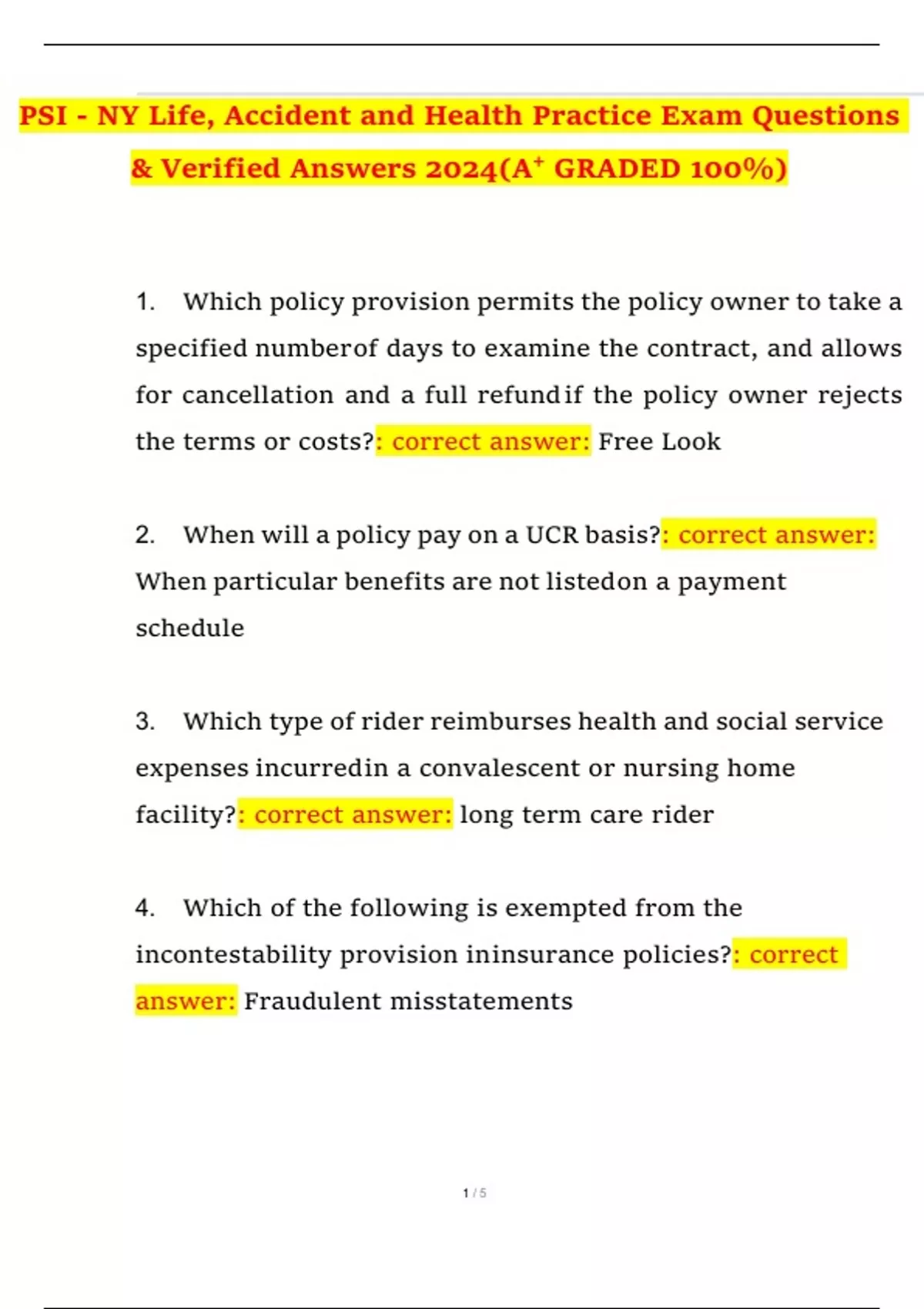 PSI - NY Life, Accident and Health Practice Exam Questions & Verified Answers 2024(A+ GRADED 100%) 1.Which policy provision permits the policy owner to take a specified number of days to examine the contract, and allows for cancellation and a full refund if the policy owner rejects the terms or costs?: correct answer: Free Look 2.When will a policy pay on a UCR basis?: correct answer: When particular benefits are not listed on a payment schedule 3.Which type of rider reimburses health and social service expenses incurred in a convalescent or nursing home facility?: correct answer: long term care rider