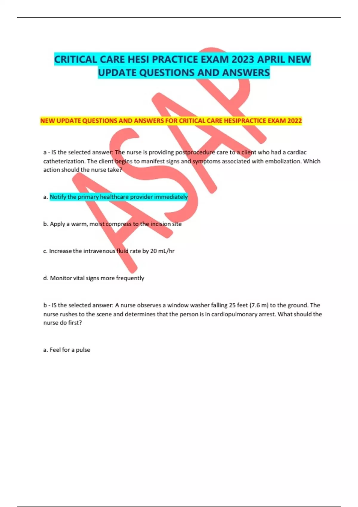 CRITICAL CARE HESI PRACTICE EXAM 2023 APRIL NEW UPDATE QUESTIONS AND ANSWERS NEW UPDATEQUESTIONS AND ANSWERS FOR CRITICAL CARE HESIPRACTICE EXAM 2022 a - IS the selected answer: The nurse is providing postprocedure care to a client who had a cardiac catheterization. The client begins to manifest signs and symptoms associated with embolization. Which action should the nurse take? a. Notify the primary healthcare provider immediately b. Apply a warm, moist compress to the incision site c. Increase the intravenousfluid rate by 20 mL/hr d. Monitor vital signs more frequently b - IS the selected answer: A nurse observes a window washer falling 25 feet (7.6 m) to the ground. The nurse rushesto the scene and determines that the person is in cardiopulmonary arrest. Whatshould the nurse do first? a. Feel for a pulse