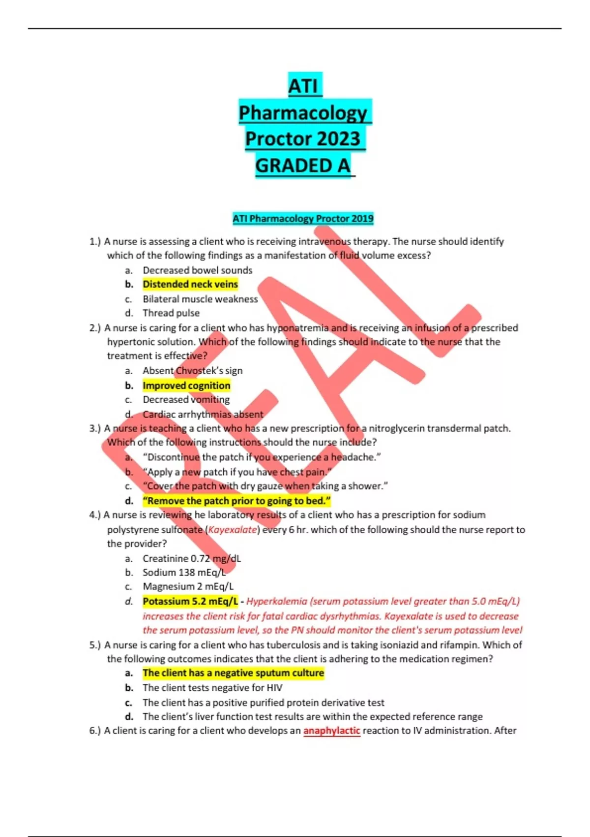 ATI Pharmacology Proctor 2023 GRADED A ATI Pharmacology Proctor 2019 1.) A nurse is assessing a client who is receiving intravenous therapy. The nurse should identify which of the following findings as a manifestation of fluid volume excess? a. Decreased bowel sounds b. Distended neck veins c. Bilateral muscle weakness d. Thread pulse 2.) A nurse is caring for a client who has hyponatremia and is receiving an infusion of a prescribed hypertonic solution. Which of the following findings should indicate to the nurse that the treatment is effective? a. Absent Chvostek’ssign b. Improved cognition c. Decreased vomiting d. Cardiac arrhythmias absent 3.) A nurse is teaching a client who has a new prescription for a nitroglycerin transdermal patch. Which of the following instructions should the nurse include? a. “Discontinue the patch if you experience a headache.” b. “Apply a new patch if you have chest pain.” c. “Cover the patch with dry gauze when taking a shower.” d. “Remove the patch prior to going to bed.” 4.) A nurse is reviewing he laboratory results of a client who has a prescription for sodium polystyrene sulfonate (Kayexalate) every 6 hr. which of the following should the nurse report to the provider? a. Creatinine 0.72 mg/dL b. Sodium 138 mEq/L c. Magnesium 2 mEq/L d. Potassium 5.2 mEq/L - Hyperkalemia (serum potassium level greater than 5.0 mEq/L) increases the client risk for fatal cardiac dysrhythmias. Kayexalate is used to decrease the serum potassium level, so the PN should monitor the client's serum potassium level 5.) A nurse is caring for a client who hastuberculosis and is taking isoniazid and rifampin. Which of the following outcomes indicates that the client is adhering to the medication regimen? a. The client has a negative sputum culture b. The client tests negative for HIV c. The client has a positive purified protein derivative test d. The client’s liver function test results are within the expected reference range 6.) A client is caring for a client who develops an anaphylactic reaction to IV administration. After