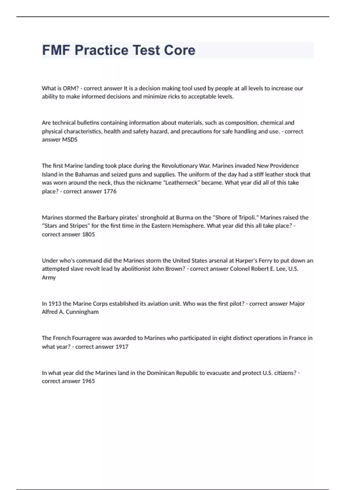 FMF Practice Test Core What is ORM? - correct answer It is a decision making tool used by people at all levels to increase our ability to make informed decisions and minimize ricks to acceptable levels. Are technical bulletins containing information about materials, such as composition, chemical and physical characteristics, health and safety hazard, and precautions for safe handling and use. - correct answer MSDS The first Marine landing took place during the Revolutionary War. Marines invaded New Providence Island in the Bahamas and seized guns and supplies. The uniform of the day had a stiff leather stock that was worn around the neck, thus the nickname "Leatherneck" became. What year did all of this take place? - correct answer 1776 Marines stormed the Barbary pirates' stronghold at Burma on the "Shore of Tripoli." Marines raised the "Stars and Stripes" for the first time in the Eastern Hemisphere. What year did this all take place? - correct answer 1805 Under who's command did the Marines storm the United States arsenal at Harper's Ferry to put down an attempted slave revolt lead by abolitionist John Brown? - correct answer Colonel Robert E. Lee, U.S. Army In 1913 the Marine Corps established its aviation unit. Who was the first pilot? - correct answer Major Alfred A. Cunningham The French Fourragere was awarded to Marines who participated in eight distinct operations in France in what year? - correct answer 1917 In what year did the Marines land in the Dominican Republic to evacuate and protect U.S. citizens? - correct answer 1965