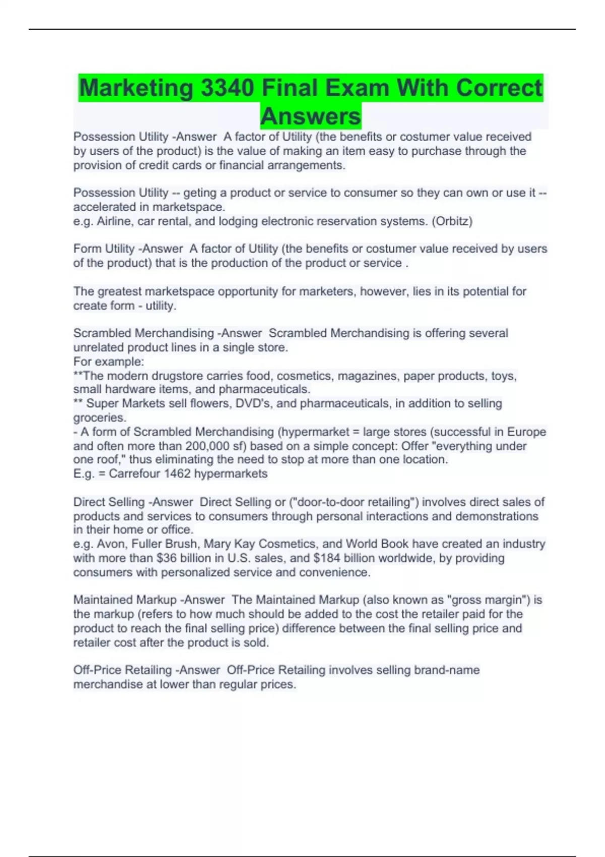 Possession Utility -Answer A factor of Utility (the benefits or costumer value received by users of the product) is the value of making an item easy to purchase through the provision of credit cards or financial arrangements. Possession Utility -- geting a product or service to consumer so they can own or use it -- accelerated in marketspace. e.g. Airline, car rental, and lodging electronic reservation systems. (Orbitz) Form Utility -Answer A factor of Utility (the benefits or costumer value received by users of the product) that is the production of the product or service . The greatest marketspace opportunity for marketers, however, lies in its potential for create form - utility. Scrambled Merchandising -Answer Scrambled Merchandising is offering several unrelated product lines in a single store. For example: **The modern drugstore carries food, cosmetics, magazines, paper products, toys, small hardware items, and pharmaceuticals. ** Super Markets sell flowers, DVD's, and pharmaceuticals, in addition to selling groceries. - A form of Scrambled Merchandising (hypermarket = large stores (successful in Europe and often more than 200,000 sf) based on a simple concept: Offer "everything under one roof," thus eliminating the need to stop at more than one location. E.g. = Carrefour 1462 hypermarkets Direct Selling -Answer Direct Selling or ("door-to-door retailing") involves direct sales of products and services to consumers through personal interactions and demonstrations in their home or office. e.g. Avon, Fuller Brush, Mary Kay Cosmetics, and World Book have created an industry with more than $36 billion in U.S. sales, and $184 billion worldwide, by providing consumers with personalized service and convenience. Maintained Markup -Answer The Maintained Markup (also known as "gross margin") is the markup (refers to how much should be added to the cost the retailer paid for the product to reach the final selling price) difference between the final selling price and retailer cost after the product is sold. Off-Price Retailing -Answer Off-Price Retailing involves selling brand-name merchandise at lower than regular prices.