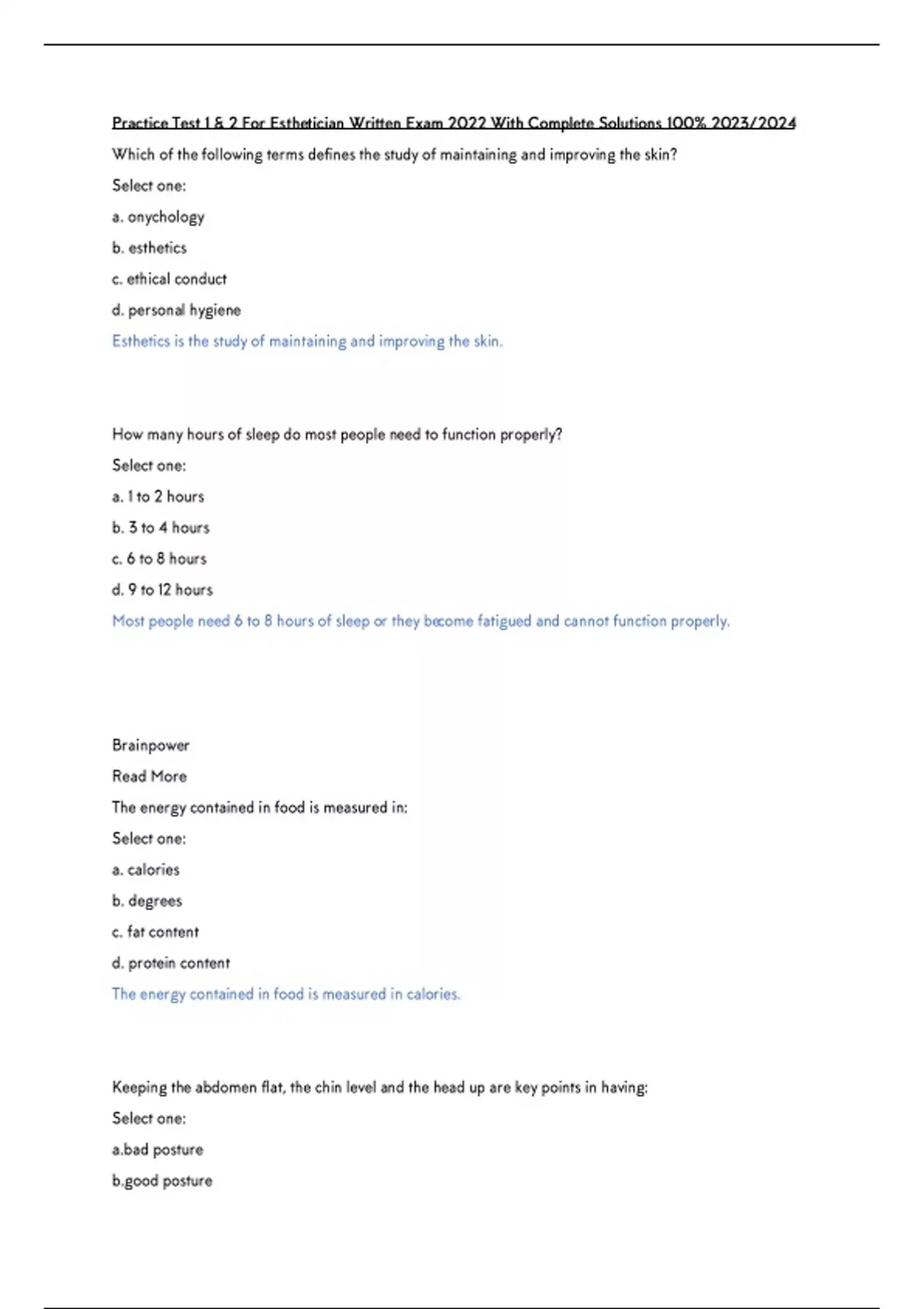 Practice Test 1 & 2 For Esthetician Written Exam 2022 With Complete Solutions 100% 2023/2024