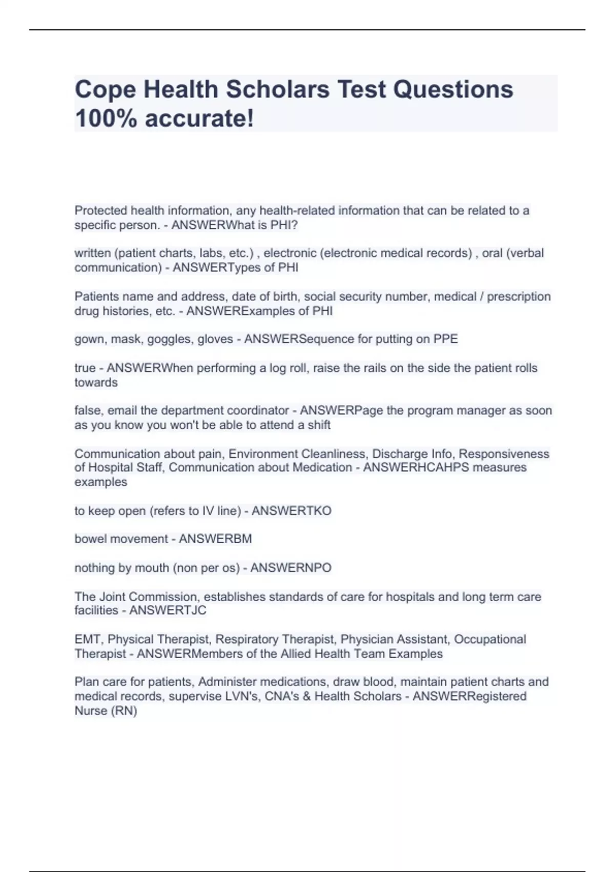 Cope Health Scholars Test Questions 100% accurate! Protected health information, any health-related information that can be related to a specific person. - ANSWERWhat is PHI? written (patient charts, labs, etc.) , electronic (electronic medical records) , oral (verbal communication) - ANSWERTypes of PHI Patients name and address, date of birth, social security number, medical / prescription drug histories, etc. - ANSWERExamples of PHI gown, mask, goggles, gloves - ANSWERSequence for putting on PPE true - ANSWERWhen performing a log roll, raise the rails on the side the patient rolls towards false, email the department coordinator - ANSWERPage the program manager as soon as you know you won't be able to attend a shift Communication about pain, Environment Cleanliness, Discharge Info, Responsiveness of Hospital Staff, Communication about Medication - ANSWERHCAHPS measures