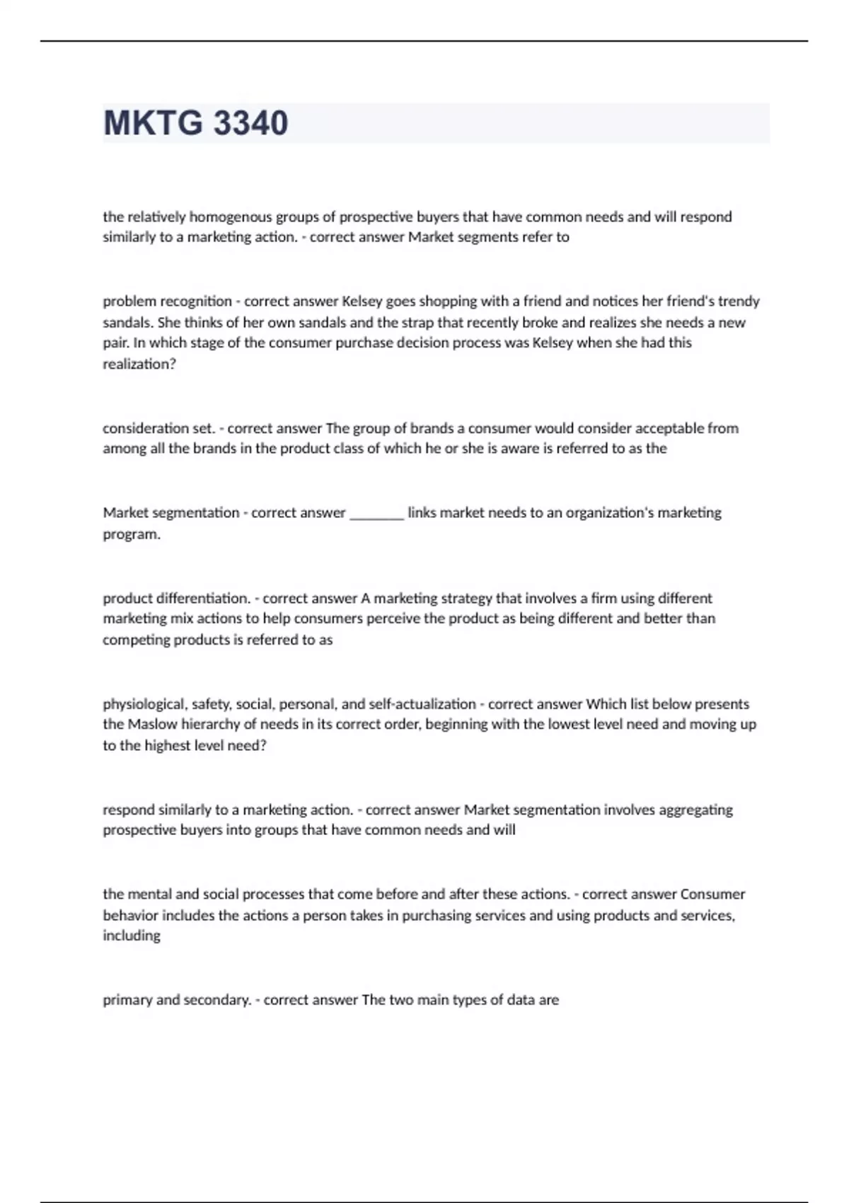 MKTG 3340 the relatively homogenous groups of prospective buyers that have common needs and will respond similarly to a marketing action. - correct answer Market segments refer to problem recognition - correct answer Kelsey goes shopping with a friend and notices her friend's trendy sandals. She thinks of her own sandals and the strap that recently broke and realizes she needs a new pair. In which stage of the consumer purchase decision process was Kelsey when she had this realization? consideration set. - correct answer The group of brands a consumer would consider acceptable from among all the brands in the product class of which he or she is aware is referred to as the Market segmentation - correct answer _______ links market needs to an organization's marketing program. product differentiation. - correct answer A marketing strategy that involves a firm using different marketing mix actions to help consumers perceive the product as being different and better than competing products is referred to as physiological, safety, social, personal, and self-actualization - correct answer Which list below presents the Maslow hierarchy of needs in its correct order, beginning with the lowest level need and moving up to the highest level need? respond similarly to a marketing action. - correct answer Market segmentation involves aggregating prospective buyers into groups that have common needs and will the mental and social processes that come before and after these actions. - correct answer Consumer behavior includes the actions a person takes in purchasing services and using products and services, including primary and secondary. - correct answer The two main types of data are observational - correct answer Fisher-Price watches young children play with its toys to determine if and how various products should be changed or improved. Fisher Price is collecting ________ data. primary data - correct answer Considering the two main types of data, if facts and figures are newly collected for a project, which type of data is being collected? a marketer's product, service, or brand contacts with a consumer from start-to-finish in the purchase decision process. - correct answer Consumer touchpoints are Data - correct answer Raw facts Information - correct answer Organized facts Action - correct answer Insights changing the perceived importance of attributes. - correct answer Marketers use three approaches to try to change consumer attitudes toward products and brands. One of these is brand loyalty. - correct answer A favorable attitude toward and consistent purchase of a single brand over time is referred to as secondary data - correct answer Children's accessory and toy store Red Carpet Baby! uses U.S. Census Bureau information to determine the number of families with children under age 5 for each state in its market area. Data obtained from this source are called product positioning - correct answer The place a product occupies in consumers' minds on important attributes relative to competitive products is referred to as self-actualization needs - correct answer The long-running U.S. Army recruiting advertisement that invited enlistees to "Be All You Can Be" appeals to which level of Maslow's hierarchy of needs?
