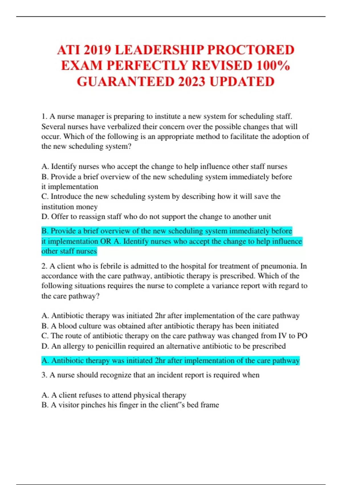 ATI 2019 LEADERSHIP PROCTORED EXAM PERFECTLY REVISED 100% GUARANTEED 2023 UPDATED