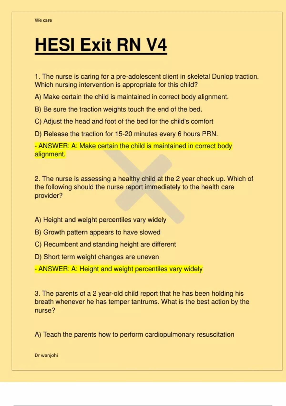 HESI Exit RN V4 1. The nurse is caring for a pre-adolescent client in skeletal Dunlop traction. Which nursing intervention is appropriate for this child? A) Make certain the child is maintained in correct body alignment. B) Be sure the traction weights touch the end of the bed. C) Adjust the head and foot of the bed for the child's comfort D) Release the traction for 15-20 minutes every 6 hours PRN. - ANSWER: A: Make certain the child is maintained in correct body alignment. 2. The nurse is assessing a healthy child at the 2 year check up. Which of the following should the nurse report immediately to the health care provider? A) Height and weight percentiles vary widely B) Growth pattern appears to have slowed C) Recumbent and standing height are different D) Short term weight changes are uneven - ANSWER: A: Height and weight percentiles vary widely 3. The parents of a 2 year-old child report that he has been holding his breath whenever he has temper tantrums. What is the best action by the nurse? A) Teach the parents how to perform cardiopulmonary resuscitation B) Recommend that the parents give in when he holds his breath to prevent anoxia C) Advise the parents to ignore breath holding because breathing will begin as a reflex