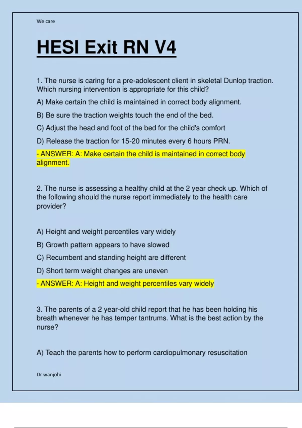 HESI Exit RN V4 1. The nurse is caring for a pre-adolescent client in skeletal Dunlop traction. Which nursing intervention is appropriate for this child? A) Make certain the child is maintained in correct body alignment. B) Be sure the traction weights touch the end of the bed. C) Adjust the head and foot of the bed for the child's comfort D) Release the traction for 15-20 minutes every 6 hours PRN. - ANSWER: A: Make certain the child is maintained in correct body alignment. 2. The nurse is assessing a healthy child at the 2 year check up. Which of the following should the nurse report immediately to the health care provider? A) Height and weight percentiles vary widely B) Growth pattern appears to have slowed C) Recumbent and standing height are different D) Short term weight changes are uneven - ANSWER: A: Height and weight percentiles vary widely 3. The parents of a 2 year-old child report that he has been holding his breath whenever he has temper tantrums. What is the best action by the nurse? A) Teach the parents how to perform cardiopulmonary resuscitation B) Recommend that the parents give in when he holds his breath to prevent anoxia C) Advise the parents to ignore breath holding because breathing will begin as a reflex