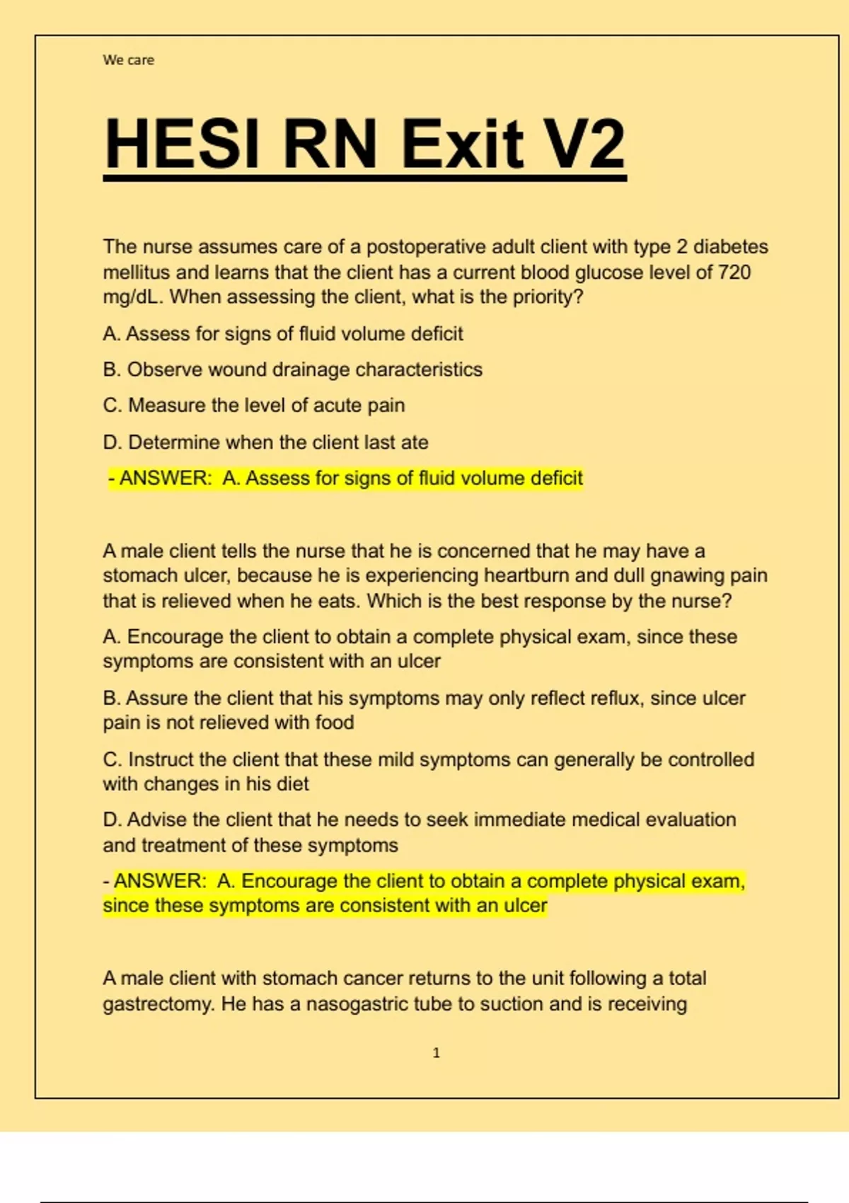 We care Dr wanjohi HESI RN Exit V2 The nurse assumes care of a postoperative adult client with type 2 diabetes mellitus and learns that the client has a current blood glucose level of 720 mg/dL. When assessing the client, what is the priority? A. Assess for signs of fluid volume deficit B. Observe wound drainage characteristics C. Measure the level of acute pain D. Determine when the client last ate - ANSWER: A. Assess for signs of fluid volume deficit A male client tells the nurse that he is concerned that he may have a stomach ulcer, because he is experiencing heartburn and dull gnawing pain that is relieved when he eats. Which is the best response by the nurse? A. Encourage the client to obtain a complete physical exam, since these symptoms are consistent with an ulcer B. Assure the client that his symptoms may only reflect reflux, since ulcer pain is not relieved with food C. Instruct the client that these mild symptoms can generally be controlled with changes in his diet D. Advise the client that he needs to seek immediate medical evaluation and treatment of these symptoms - ANSWER: A. Encourage the client to obtain a complete physical exam, since these symptoms are consistent with an ulcer A male client with stomach cancer returns to the unit following a total gastrectomy. He has a nasogastric tube to suction and is receiving Lactated Ringer's solution at