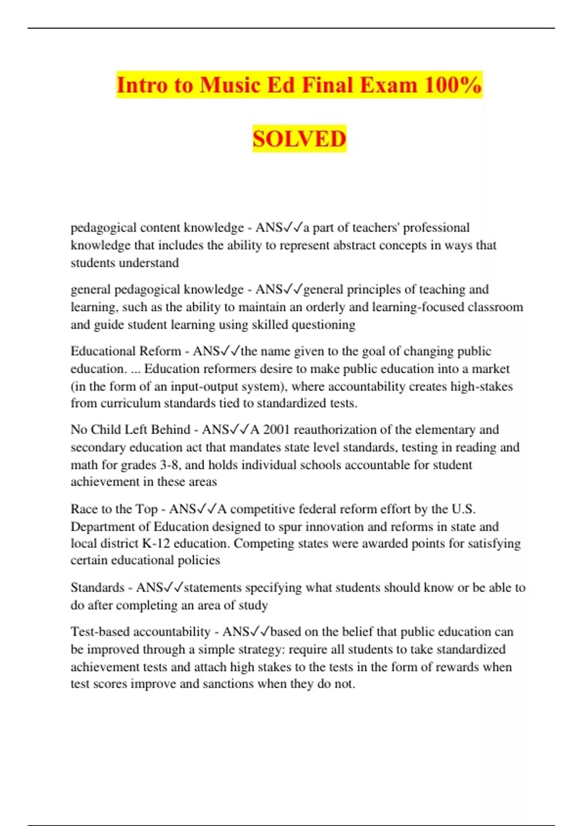 Intro to Music Ed Final Exam 100% SOLVED pedagogical content knowledge - ANSa part of teachers' professional knowledge that includes the ability to represent abstract concepts in ways that students understand general pedagogical knowledge - ANSgeneral principles of teaching and learning, such as the ability to maintain an orderly and learning-focused classroom and guide student learning using skilled questioning Educational Reform - ANSthe name given to the goal of changing public education. ... Education reformers desire to make public education into a market (in the form of an input-output system), where accountability creates high-stakes from curriculum standards tied to standardized tests. No Child Left Behind - ANSA 2001 reauthorization of the elementary and secondary education act that mandates state level standards, testing in reading and math for grades 3-8, and holds individual schools accountable for student achievement in these areas Race to the Top - ANSA competitive federal reform effort by the U.S. Department of Education designed to spur innovation and reforms in state and local district K-12 education. Competing states were awarded points for satisfying certain educational policies Standards - ANSstatements specifying what students should know or be able to do after completing an area of stud