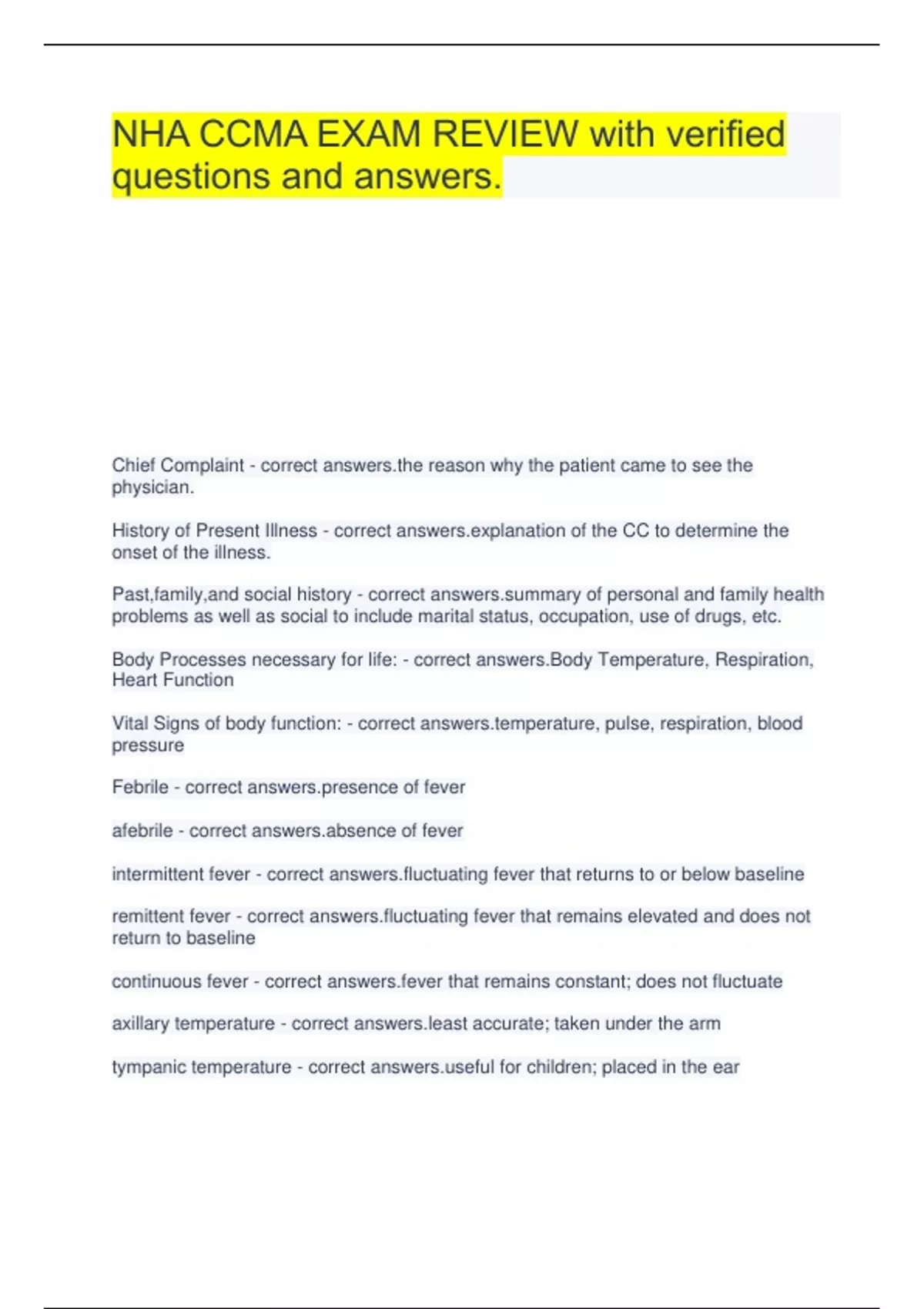 NHA CCMA EXAM REVIEW with verified questions and answers. Chief Complaint - correct reason why the patient came to see the physician. History of Present Illness - correct nation of the CC to determine the onset of the illness. Past,family,and social history - correct ry of personal and family health problems as well as social to include marital status, occupation, use of drugs, etc. Body Processes necessary for life: - correct answers.Body Temperature, Respiration, Heart Function Vital Signs of body function: - correct rature, pulse, respiration, blood pressure Febrile - correct nce of fever afebrile - correct ce of fever intermittent fever - correct uating fever that returns to or below baseline remittent fever - correct uating fever that remains elevated and does not return to baseline continuous fever - correct that remains constant; does not fluctuate axillary temperature - correct accurate; taken under the arm tympanic temperature - correct l for children; placed in the ear rectal temperature - correct rectum; most effective normal adult pulse range - correct en 60-100 bpm apical pulse - correct over the apex of the heart by auscultation normal respiration rate - correct answers.12-20 per minute (Adults) apnea - correct rary complete absence of breathing tachypnea - correct ration rate greater than 40 per minute bradypnea - correct ase in the numbers of respiration cheyne stokes - correct ar pattern of irregular breathing rate orthopnea - correct ase in numbers of respiration hypoventilation - correct ed amount of air enters the lungs resulting in decreased oxygen level hyperpnea - correct mal increase in the depth and rate of breathing hyperventilation - correct ased amount of air entering the lungs Systole - correct highest amount of pressure exerted during the cardiac cycle Diastole - correct lowest amount of pressure exerted during the cardiac cycle Palpation - correct sense of touch to determine the characteristics of an organ system Percussion - correct ng or striking the body to determine the position, size and density of the underlying organ/tissue Auscultation - correct ning to sounds produced by internal organs Horizontal Recumbent Position - correct nt lies on back w/legs extended (used for most physical exams) Dorsal Recumbent Position - correct nt lies on back with knees flexed and soles of the feet flat on the bed Fowler's Position - correct Dorsal Lithotomy Position - correct nt lies on back with knees flexed, legs seperated and thighs are acutely flexed. feet are usually in stirrups, Prone position - correct nts lies on abdomen with head turned to side Sim's position - correct nt lies on left side with right knee flexed against the abdomen and left knee slightly flexed knee-chest position - correct nt is on knees with chest resting on the bed and elbows resting on the bed above head OSHA - correct answers.Occupational Safety and Health Administration external hemorrhage - correct olling the bleeding is most effectively accomplished by elevating the affected part above heart level Shock - correct s when there is insufficient return of blood flow to the heart CPR - correct answers.Cardiopulmonary Resuscitation AMS - correct answers.Agent, Modes of Transmission, Susceptible Hosts agents - correct tious microorganisms that can be classified into groups; viruses, bacteria, fungi, and parasites Portal of Exit - correct method by which an infectious agent leaves the reservoir 5 Modes of Transmission - correct answers.Droplet, Airborne, Common Vehicle, Vectorborne, Contact (direct or indirect) Susceptible Host - correct answers.Not Resistant or Immune Medical Asepsis - correct destruction of pathogenic microorganisms after they leave the body disinfection - correct of various chemicals that can be used to destroy many pathogenic microorganisms 1:10 Solution - correct readily available and least expensive disenfectant