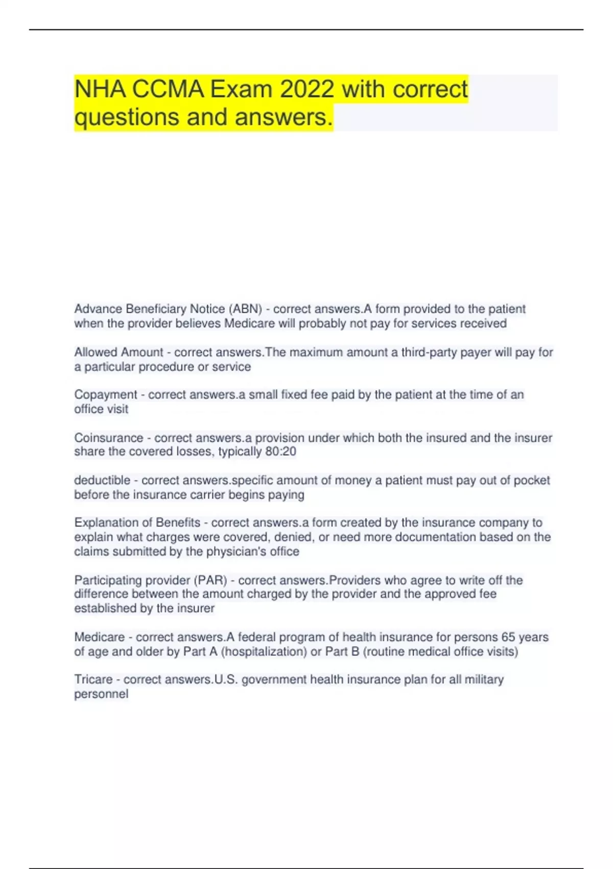 NHA CCMA Exam 2022 with correct questions and answers. Advance Beneficiary Notice (ABN) - correct answers.A form provided to the patient when the provider believes Medicare will probably not pay for services received Allowed Amount - correct answers.The maximum amount a third-party payer will pay for a particular procedure or service Copayment - correct answers.a small fixed fee paid by the patient at the time of an office visit Coinsurance - correct answers.a provision under which both the insured and the insurer share the covered losses, typically 80:20 deductible - correct fic amount of money a patient must pay out of pocket before the insurance carrier begins paying Explanation of Benefits - correct answers.a form created by the insurance company to explain what charges were covered, denied, or need more documentation based on the claims submitted by the physician's office Participating provider (PAR) - correct answers.Providers who agree to write off the difference between the amount charged by the provider and the approved fee established by the insurer Medicare - correct answers.A federal program of health insurance for persons 65 years of age and older by Part A (hospitalization) or Part B (routine medical office visits) Tricare - correct answers.U.S. government health insurance plan for all military personnel CHAMPVA - correct s surviving spouses and dependent children of veterans who died as a result of service-related disabilities Medicaid - correct des health insurance to the medically indigent population through a cost-sharing program between federal and state governments for those who meet specific eligibility criteria Managed Care - correct an umbrella term for plans that provide health care in return for preset scheduled payments and coordinated care through a defined network of providers and hospitals CMS-1500 form - correct answers.Standard insurance form used by all government and most commercial insurance payers. - 33 blocks - divided into three section CMS-1500 Section 1 - correct answers.Carrier Block: contains the address of the insurance carrier and is located at the top of the form CMS-1500 Section 2 - correct answers.Patient/insured section: contains information about the patient or insured; includes boxes 1-13 CMS-1500 Section 3 - correct answers.Physician/Supplier Section: contains information about the physician or supplier: boxes 14-33 Supine Position - correct answers. Dorsal Recumbent Position - correct answers. Sims' Position - correct answers. Knee-elbow position - correct answers. Fowler's Position - correct answers. Lithotomy Position - correct answers. Epidural Injection - correct ral space of the spine Intra-arterial Injection - correct tion into an artery (to break up clots) Intra-articular Injection - correct tion into joint space Intradermal Injection - correct answers.Skin of the upper chest, forearms, upper pack. 5-15º angle intramuscular injection - correct id, vastus lateralis, ventrogluteal muscles Intraosseous Injection - correct answers.Bone marrow Intraperitoneal Injection - correct n the peritoneal cavity Intrapleural Injection - correct al space (lungs) Intrathecal Injection - correct answers.Subarachnoid space (brain) Fat soluble vitamins - correct answers.A, D, E, K Water Soluble vitamins - correct answers.B1, B2, B3, B6, Folate, B12, Pantothenic acid, biotin, C. Erikson's stages of psychosocial development - correct answers.1. trust vs. mistrust 2. autonomy vs. shame and doubt 3. initiative vs. guilt 4. industry vs. inferiority 5. identity vs. role confusion 6. intimacy vs. isolation 7. generativity vs. stagnation 8. integrity vs. despair Grief Cycle - correct l, anger, bargaining, depression, acceptance Sagittal Plane - correct es body into left and right Coronal Plane - correct es body into front and back Transverse Plane - correct ontal division of the body into upper and lower portions Right Upper Quadrant (RUQ) - correct answers.Right lobe of liver, gallbladder, right kidney, portions of stomach, small and large intestine Left Upper Quadrant (LUQ) - correct answers.Left lobe of liver, stomach, pancreas, left kidney, spleen, portions of large intestine Right Lower Quadrant (RLQ) - correct , appendix, right ovary and tube, right ureter, right spermatic cord Left Lower Quadrant (LLQ) - correct ins parts of the small and large intestines, left ovary, left fallopian tube, left ureter Epigastric Region - correct ed above the stomach